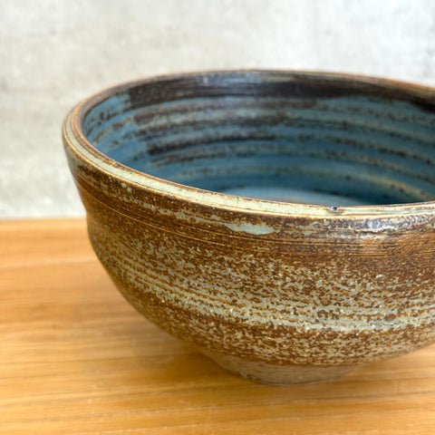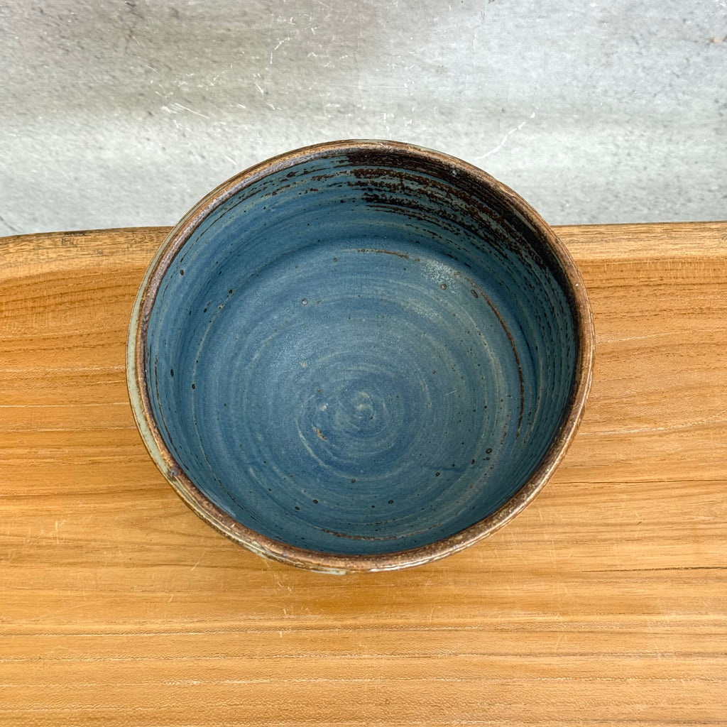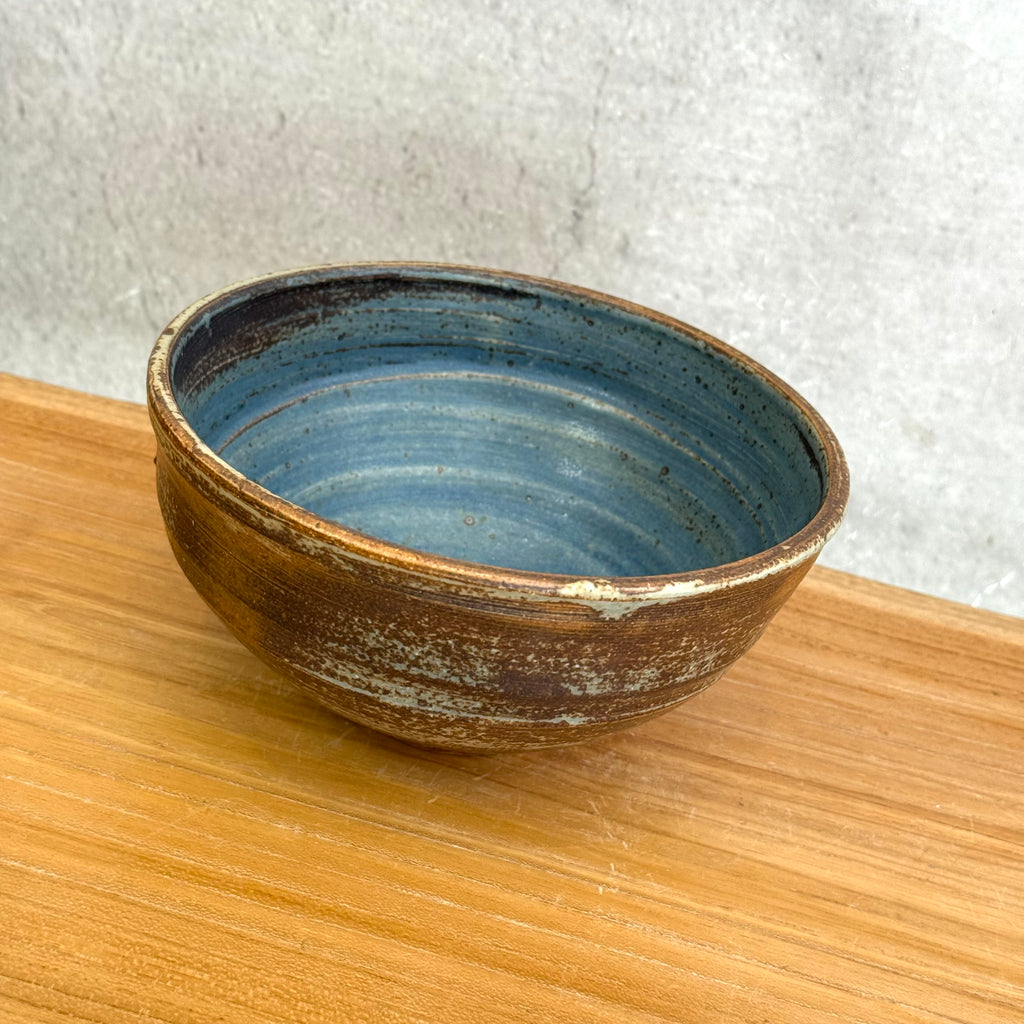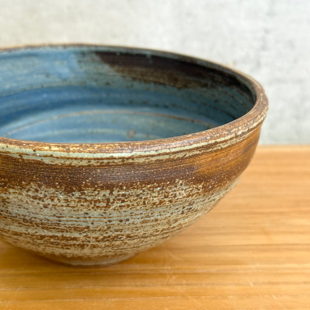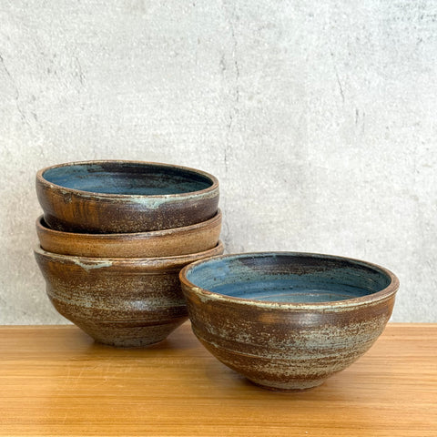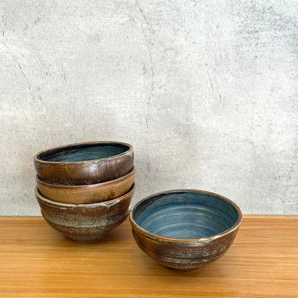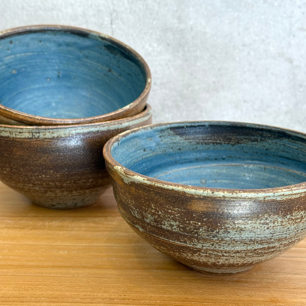 Rice bowls in ash glaze over blue slip by David Collins from November 2025.