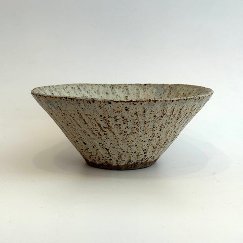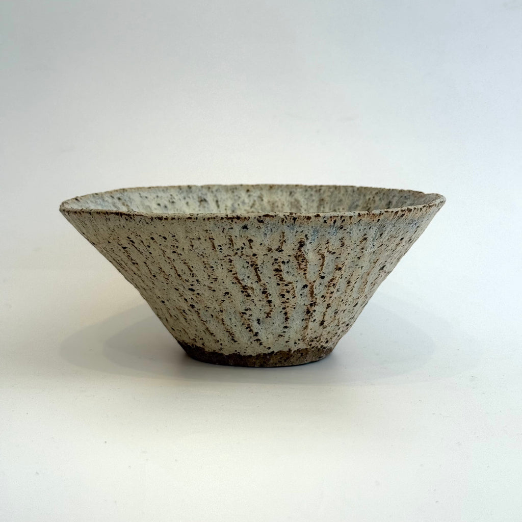 Small in diameter, with a high straight side, this gorgeous, perfectly proportioned little vessel has a carved texture and is finished with white wash over brown speckle.