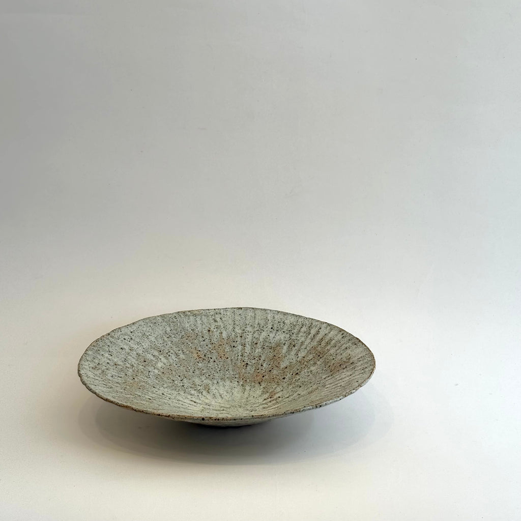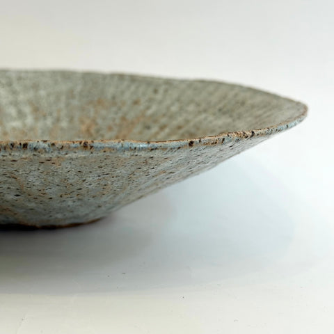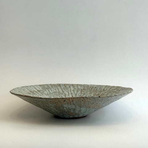 Wide, with a low straight side, this elegant serving vessel has a carved texture and is finished in a wash of pale grey/green over soft brown speckle.