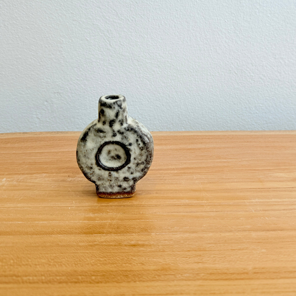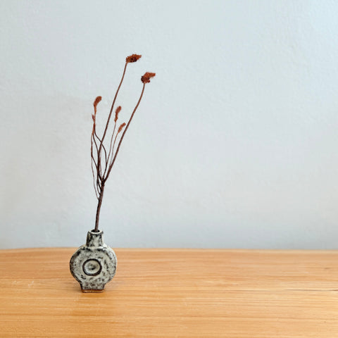 Tiny, disk-shaped ceramic bud vase by Emma Young, from December 2025.