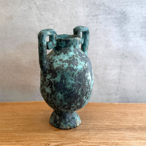 Small, urn-shaped vase with handles, in a dark green speckle glaze, by Kelly Brown from October 2025.
