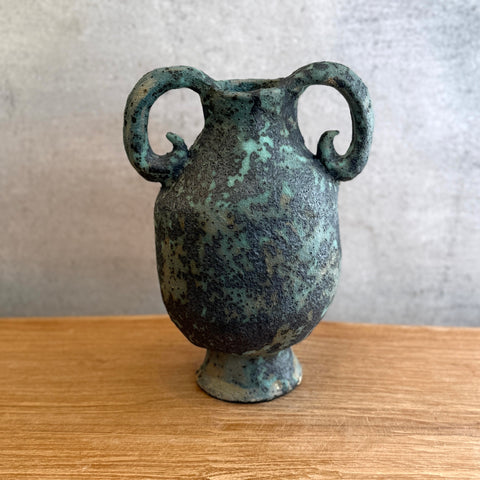Small, urn-shaped vase with handles, in a dark green speckle glaze, by Kelly Brown from October 2025.