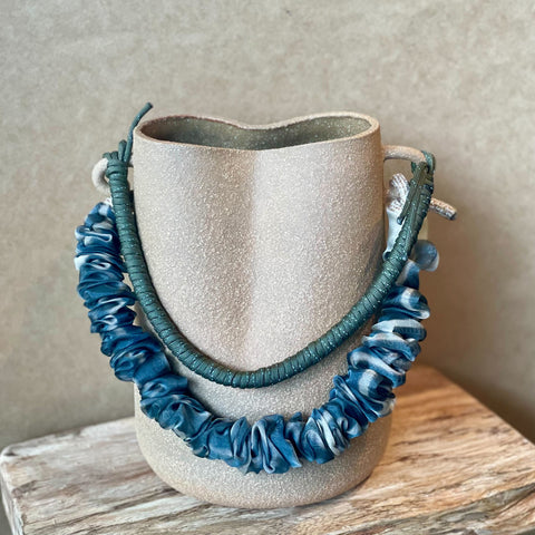 This gorgeous vessel has a circular base that tapers to an indented opening, reminiscent of a basket top - an effect enhanced by having two different fabric handles attached to the sides, one in woven green and one in blue and white ruffles.
