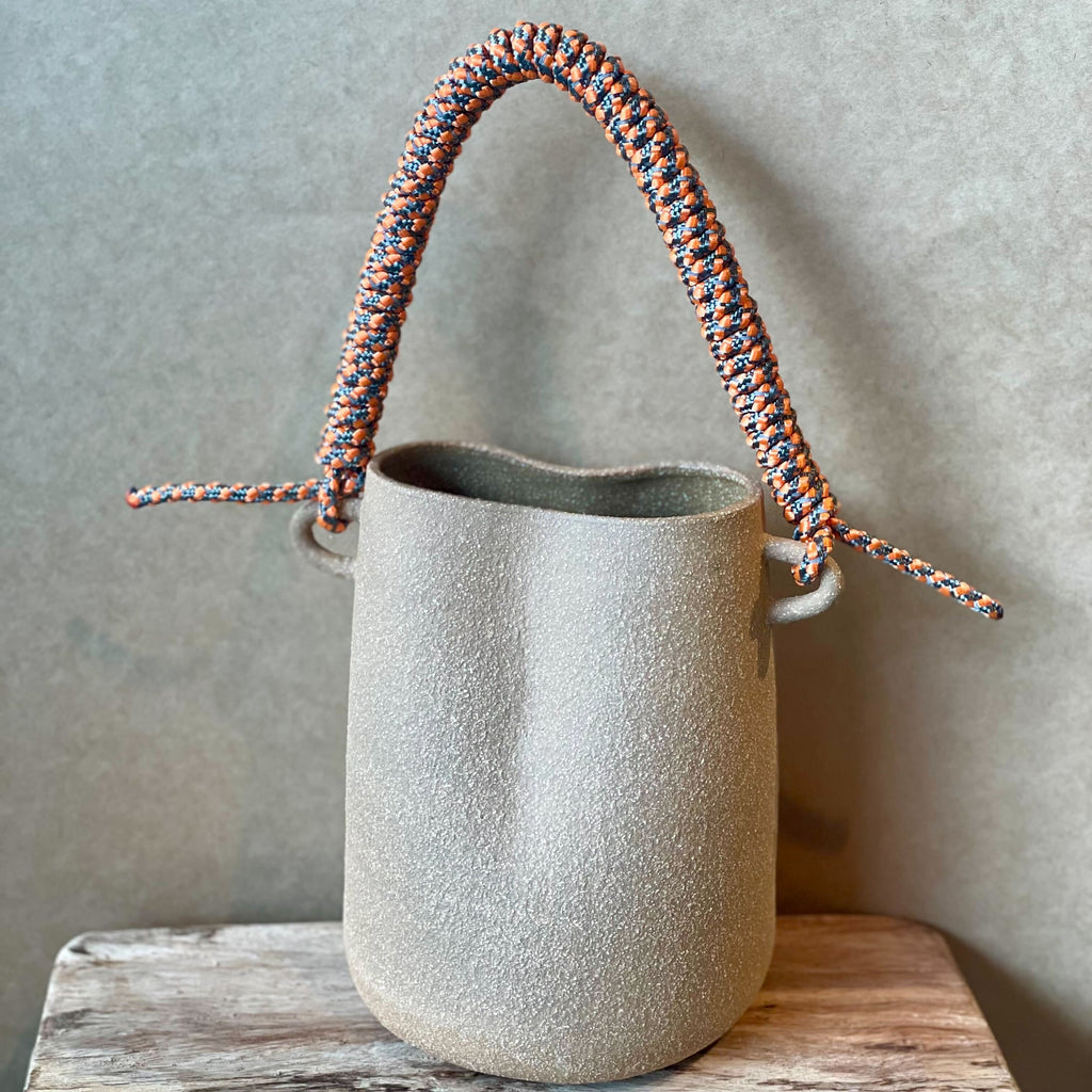 Small, basket-shaped ceramic vase with fabric handle, by Rina Bernabei in collaboration with Barbara Rogers, from October 2025.