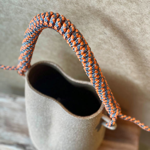 This gorgeous vessel has a circular base that tapers to an indented opening, reminiscent of a basket top - an effect enhanced by the woven fabric handle in orange and blue attached to each side.
