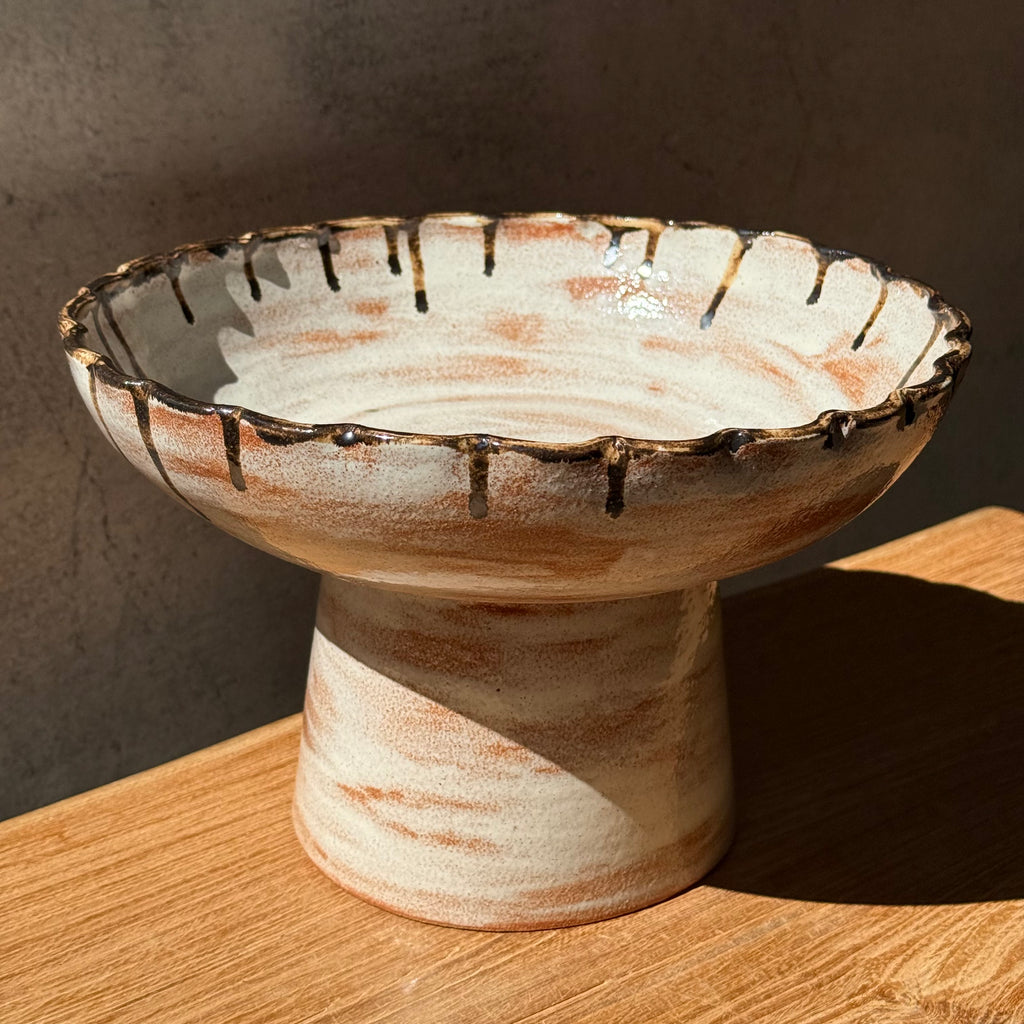 Featuring a sloping pedestal base, topped with a wide, high-rimmed bowl with undulating edge, this lovely vessel is finished in a clear gloss glaze over soft washes of white, with brown drip highlights around the rim.