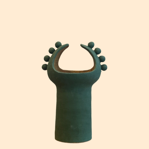 Drawing on her love of nature she individually hand-builds her pieces using a combination of curves, colours and textures, often adorned with jaunty shapes.