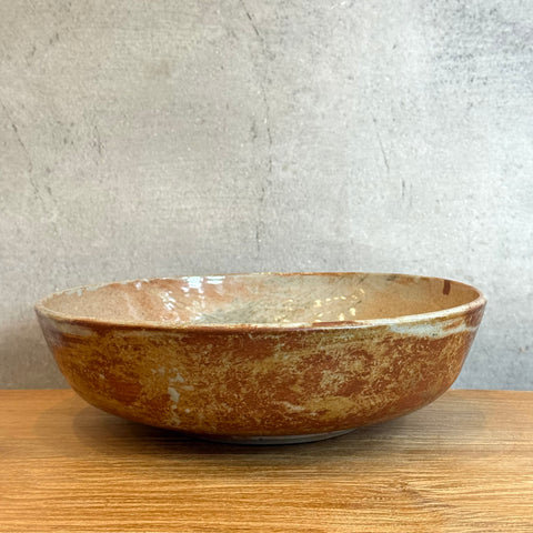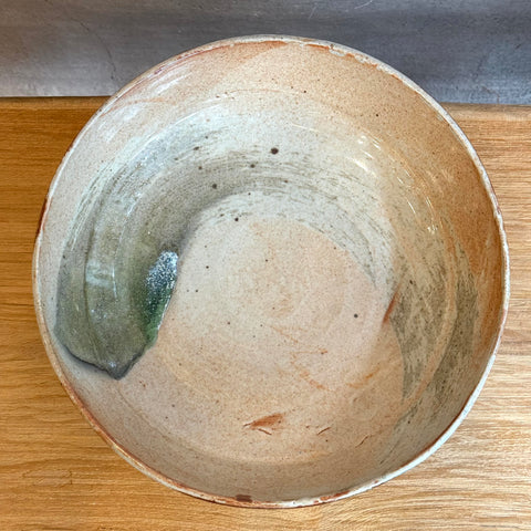 This stunning, wide, high-sided bowl features a wash of pale orange shino inside, overlaid with a dramatic splash of green, then finished with a lovely, textured fawn on the exterior.