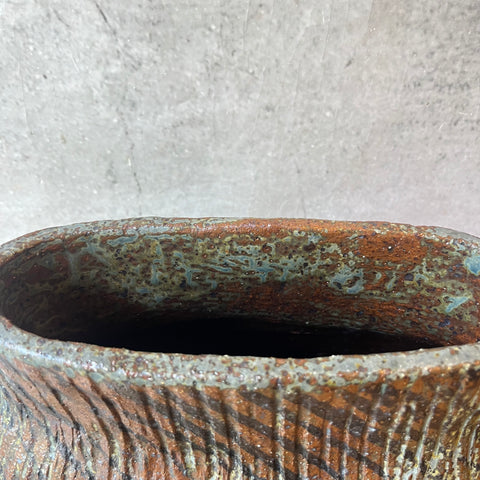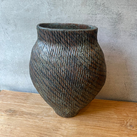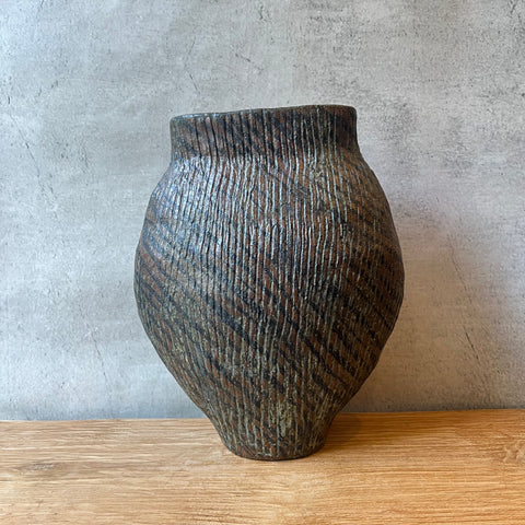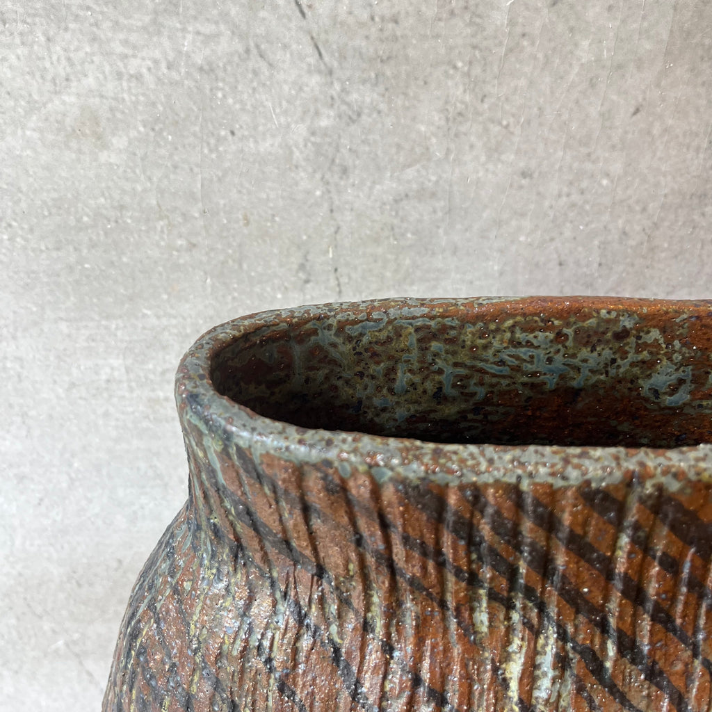 Handbuilt from dark stoneware clay and finished with vertical carving crossed with diagonal detailing - another powerful masterpiece from a master potter.