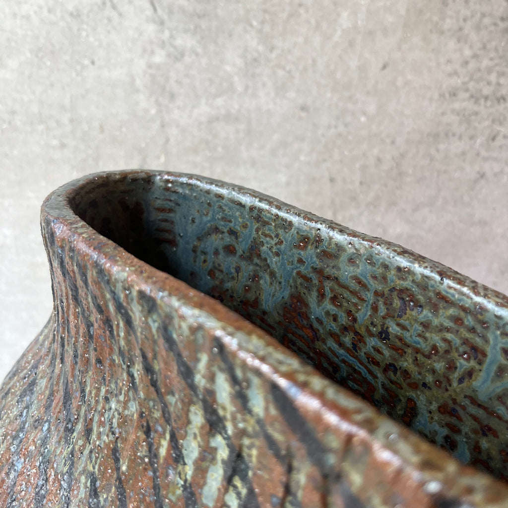 Tall, wide, pedestal vase with a flattened, elongated shape, by Timna Taylor from February 2026.