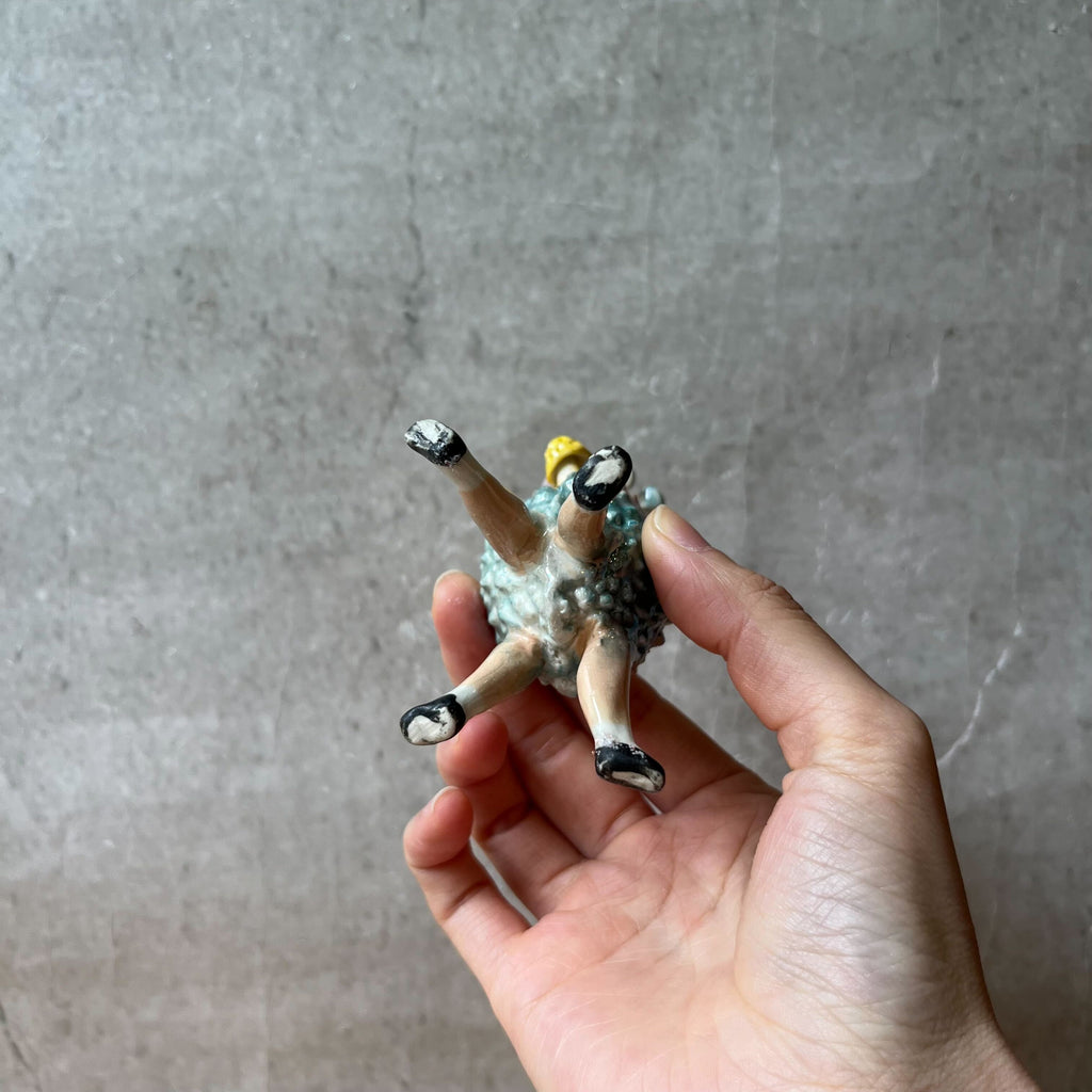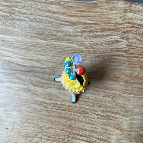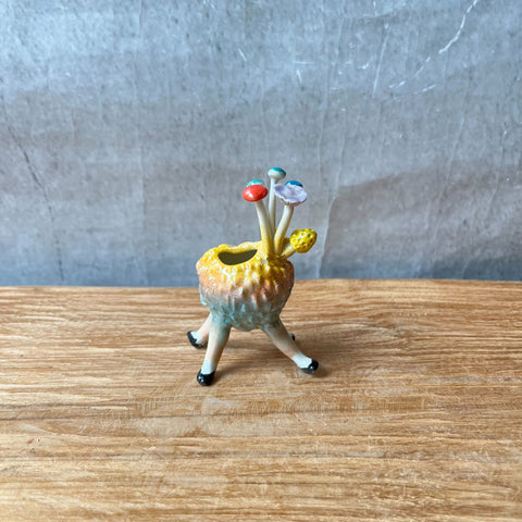 This delightful vessel is based on the shape of a lychee, lovingly rendered in gradated yellows, pinks and blues, brought to life with four black patent shoe clad legs, then imbued with extra whimsy, by a brace of multi-coloured mushrooms and toadstools growing from its top.