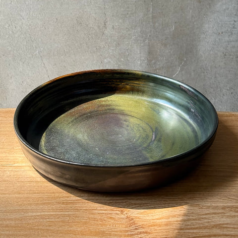 Large, high-sided ceramic platter in kurogaratsu (black Karatsu clay) by Yukiko Tsuchiya from November 2025.