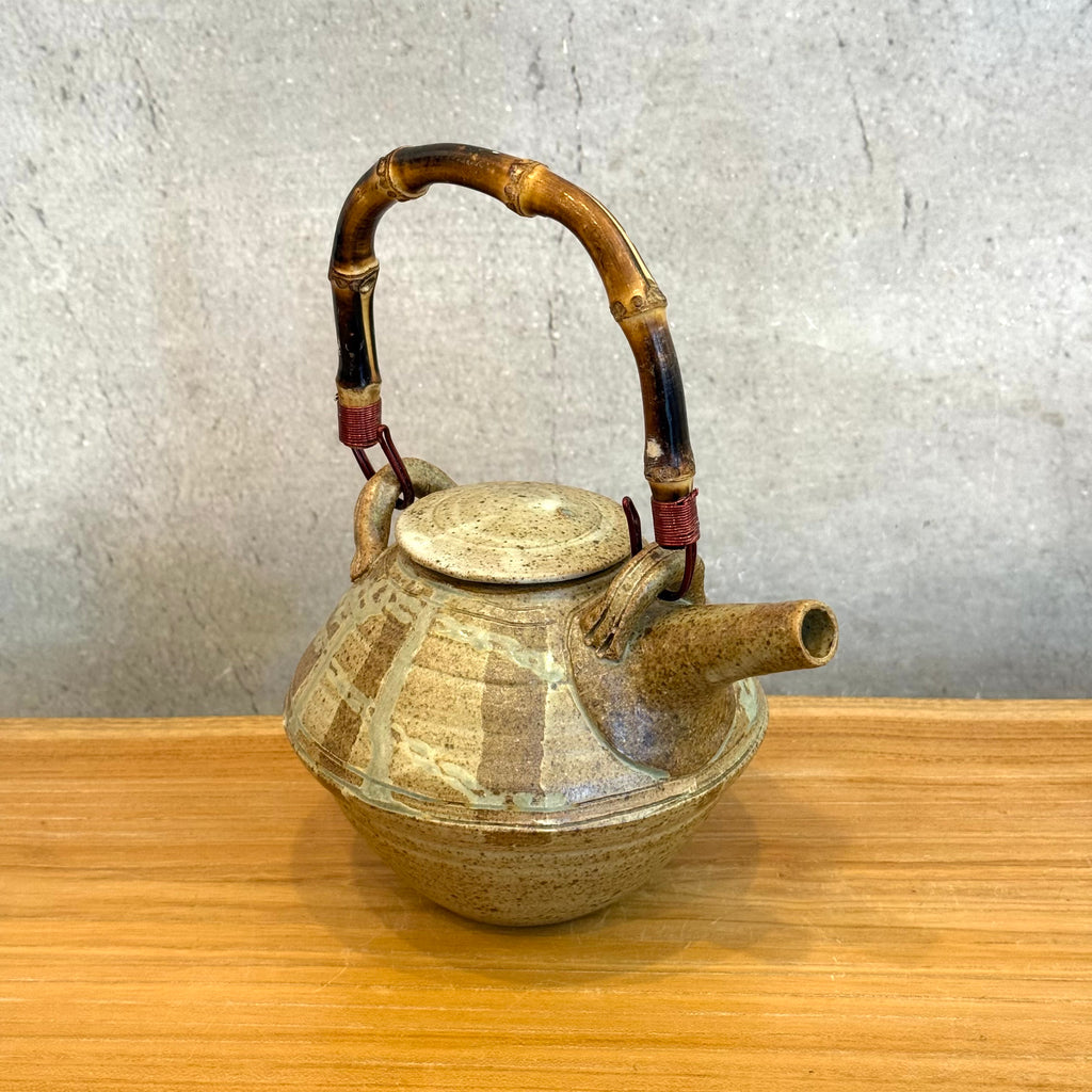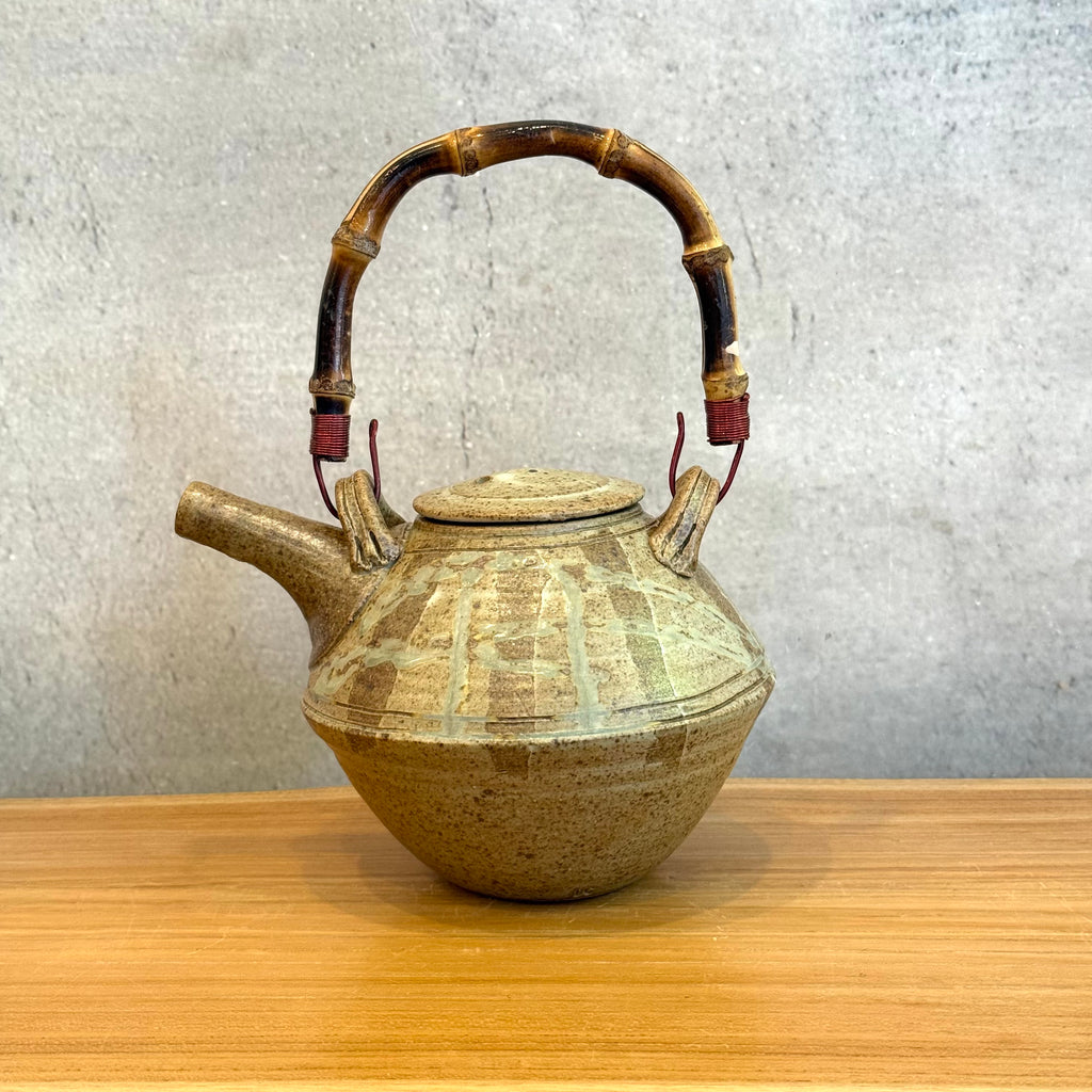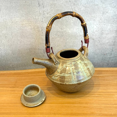 Ceramic teapot w/ lid, cane handle w/ metal hooks.