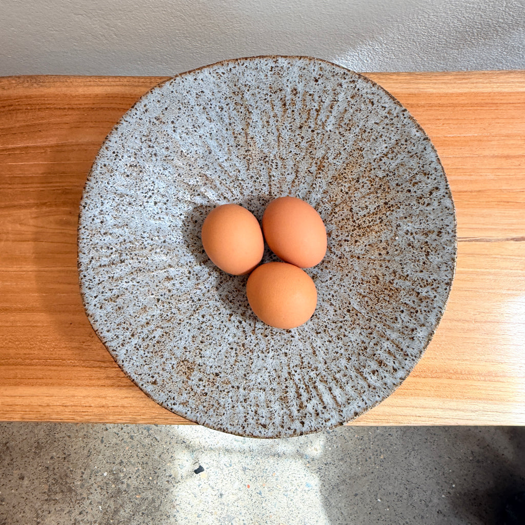 Shallow serving bowl in white by Emily Belle Ellis from October 2025.