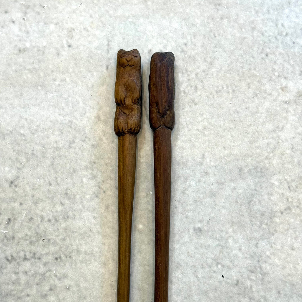 Hand-carved wooden chopsticks with "cats" design by Izumi Okuyama from December 2025.