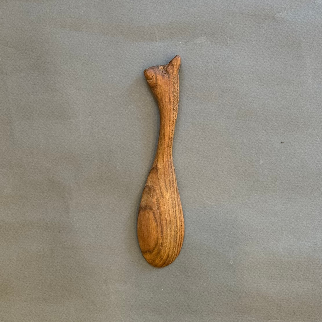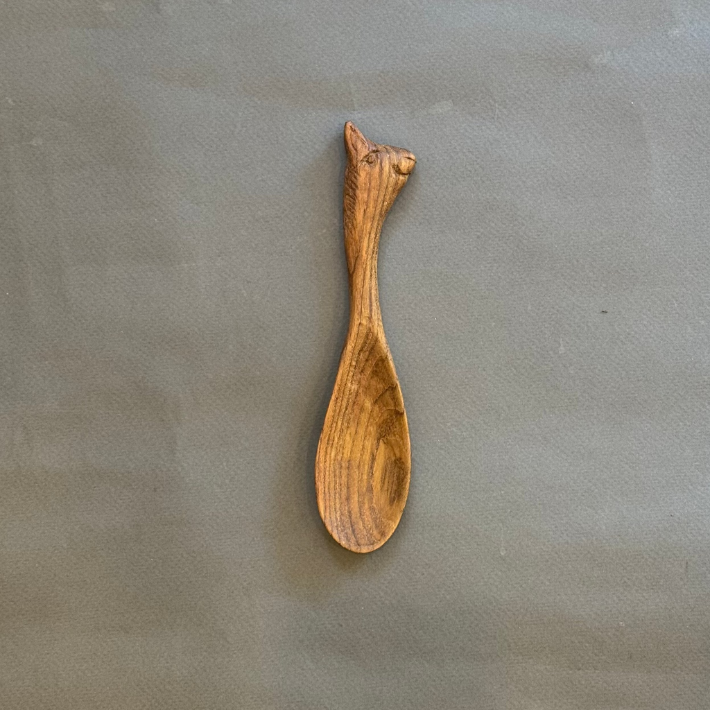 Hand-carved wooden spoon with "llama" design by Izumi Okuyama from December 2025.