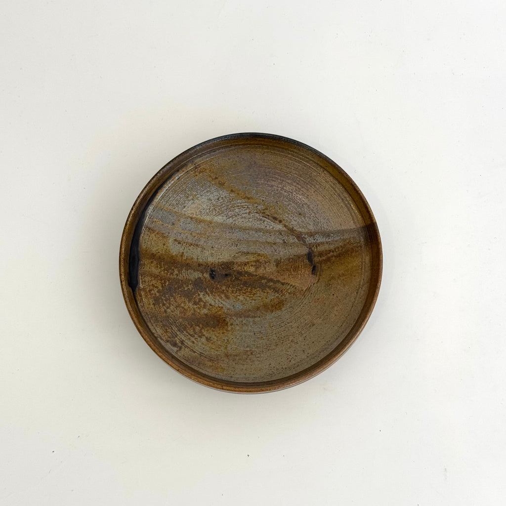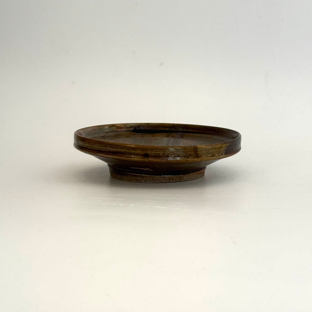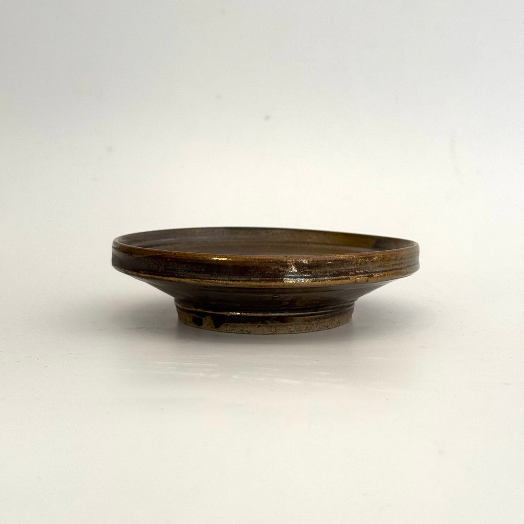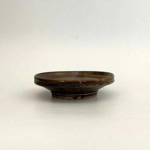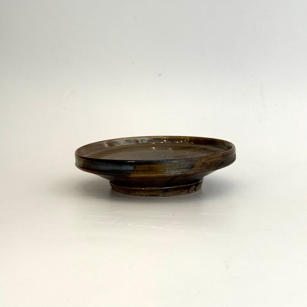 Small, footed ceramic plate in kurogaratsu (black Karatsu clay), by Yukiko Tsuchiya from November 2025.