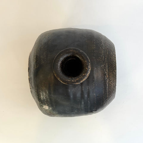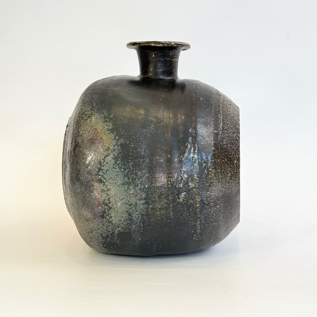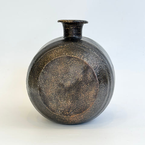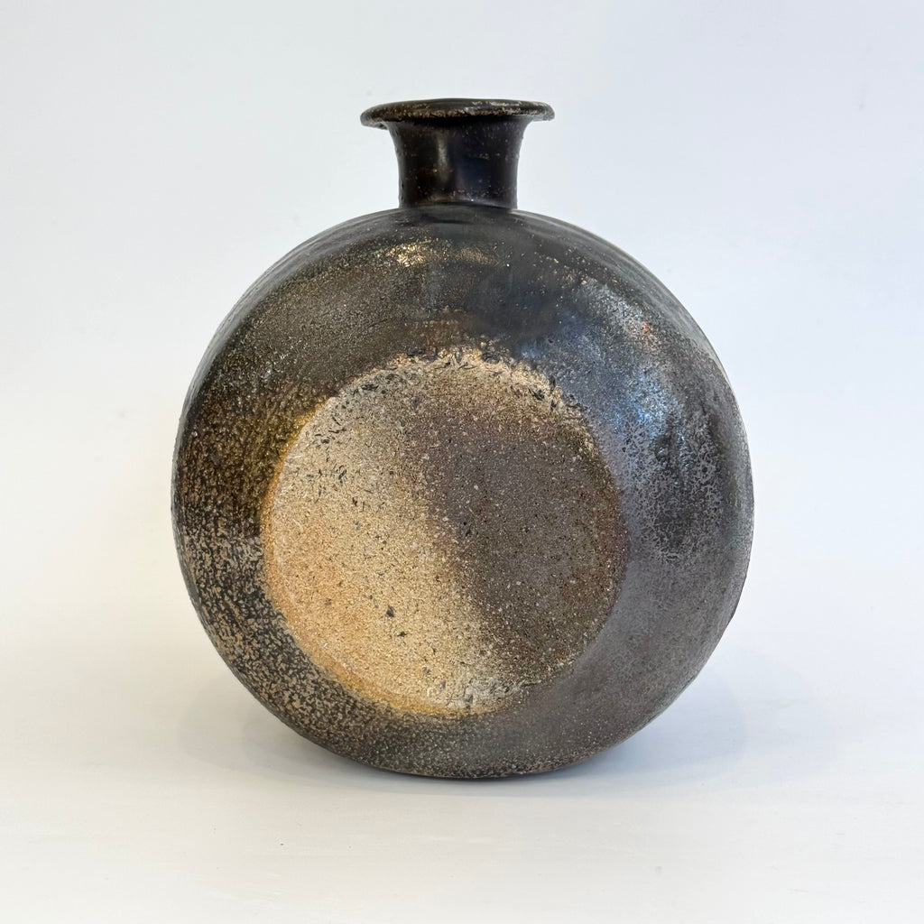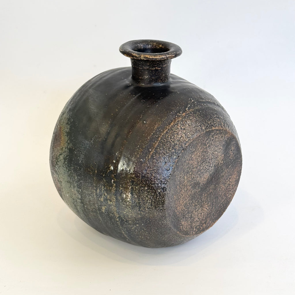 Large, barrel-shaped, ceramic vase with bottle neck, in kurogaratsu (black Karatsu clay), by Yukiko Tsuchiya from November 2025.