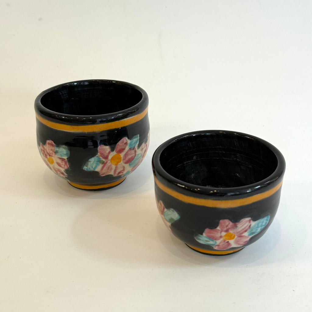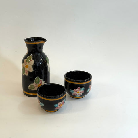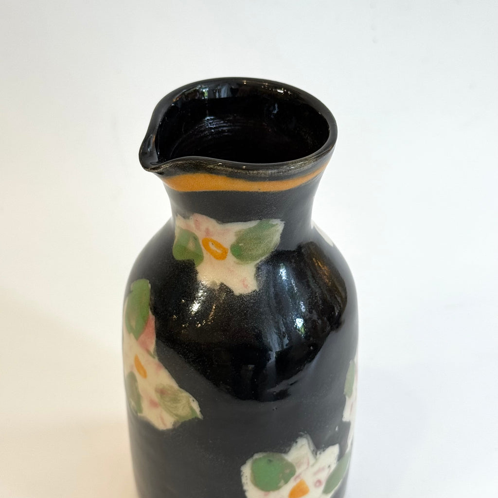 This lovely and generously proportioned set features a large tokkuri (sake pourer) and two large guinomi (sake cups) in a gorgeous painted floral pattern on a rich glossy black glaze, highlighted with caramel stripes top and bottom.