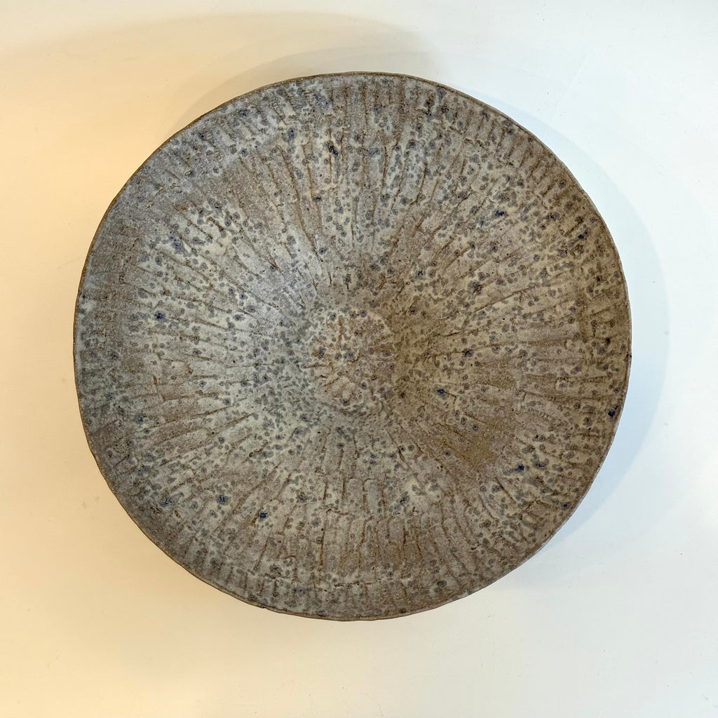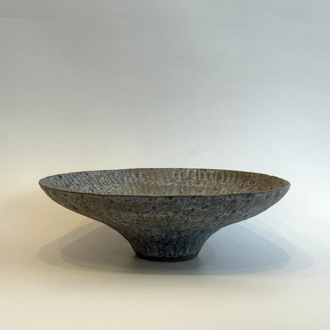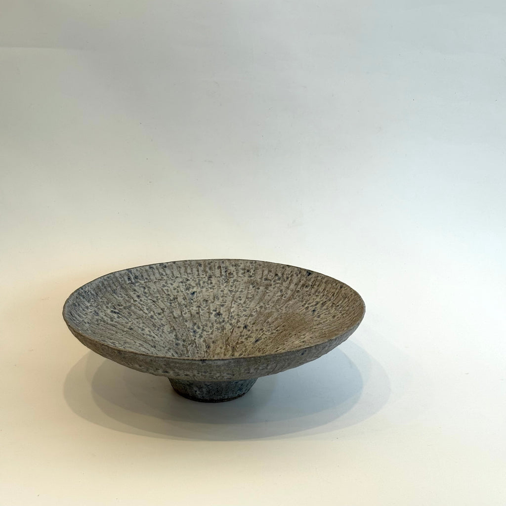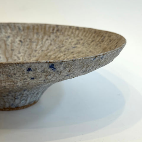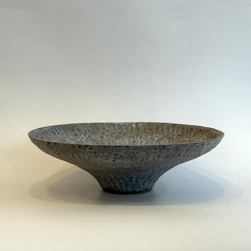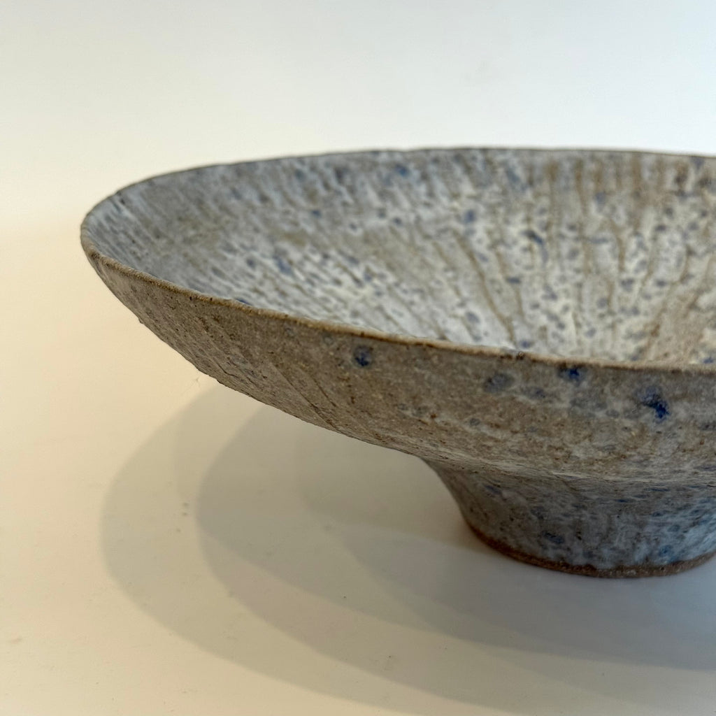 Wide and gently curving, atop a small pedestal base, this stunning vessel features a carved, textured surface, finished in washes of white over dark speckled clay.
