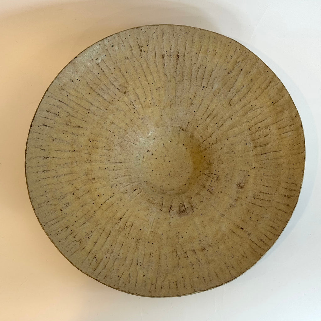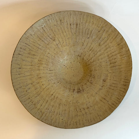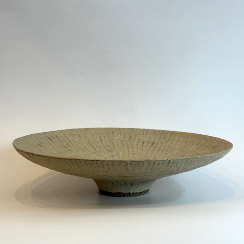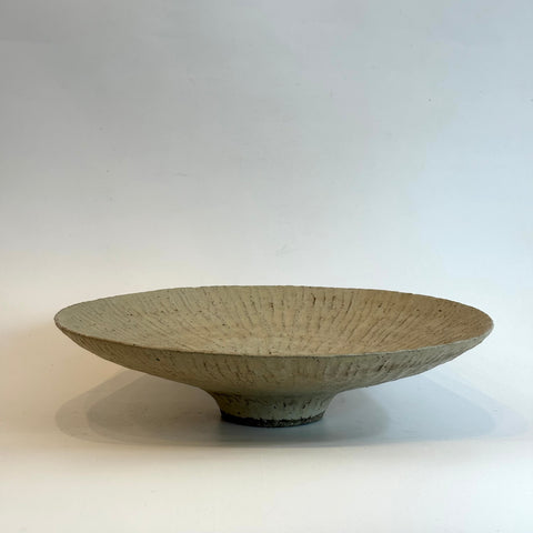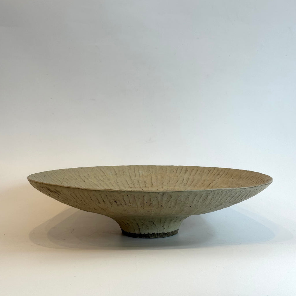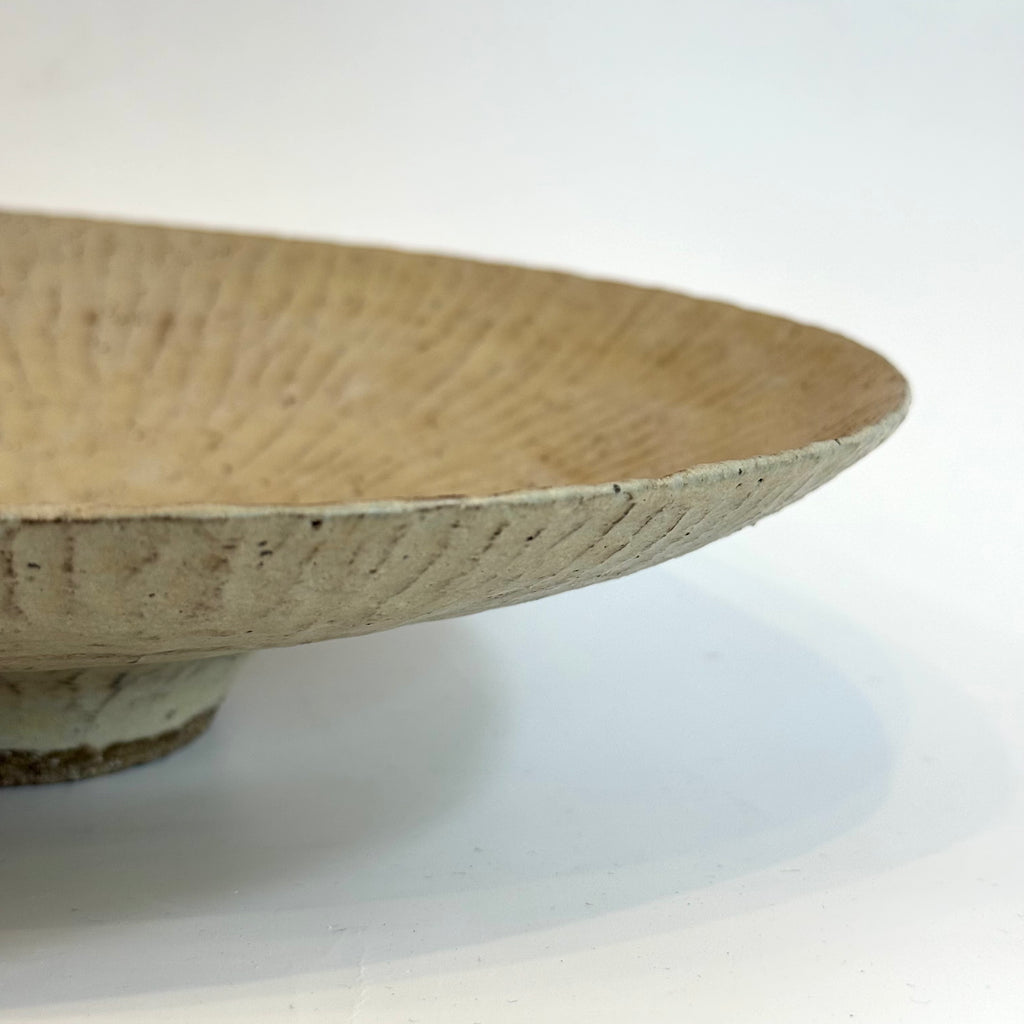 Wide and gently curving, atop a small pedestal base, this stunning vessel features a carved, textured surface, finished in a lovely, matte, fawn-coloured glaze over dark brown clay.