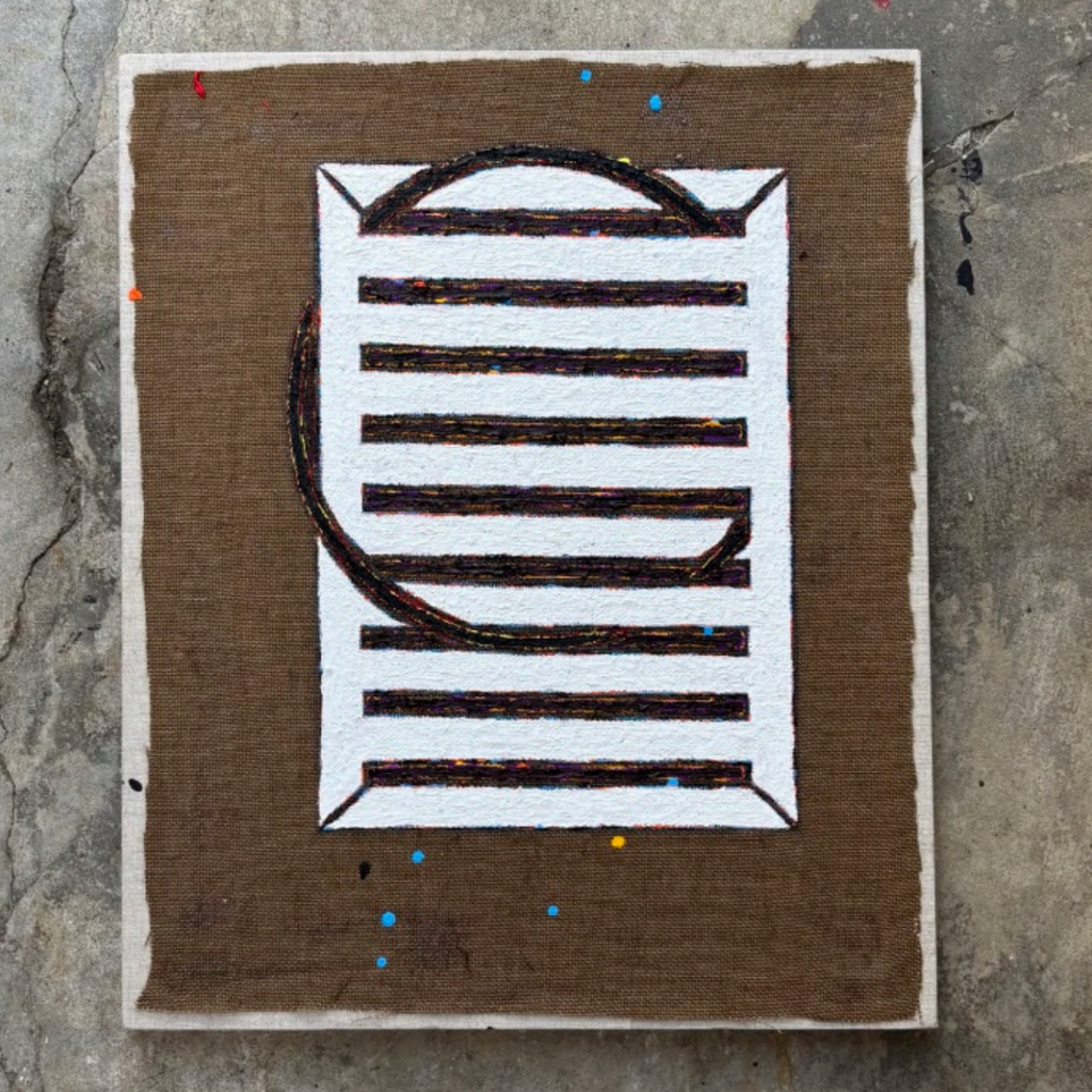 Painting in graphite, acrylic and oil on burlap glued to canvas from 2025 by Australian artist Joel Plunkett - part of a body of work called "The Squeeze".