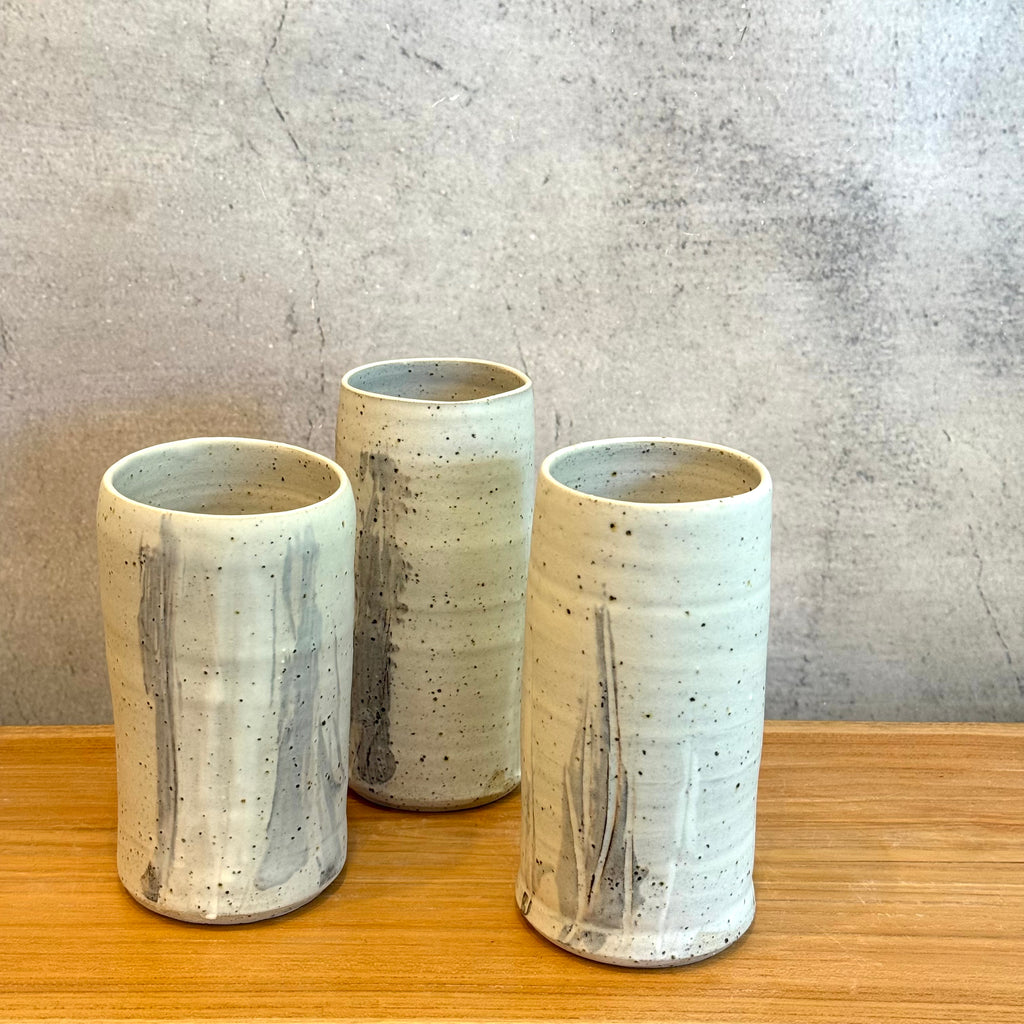 Organic, cylindrical vessels featuring washes of Rosemary's white speckle, semi-textured glaze, detailed with small speckles, over an exposed clay base.