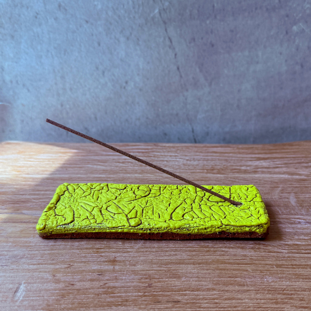 Flat, rectangular, ceramic incense holder in a yellow crawl glaze, by Stephanie Phillips from December 2025.