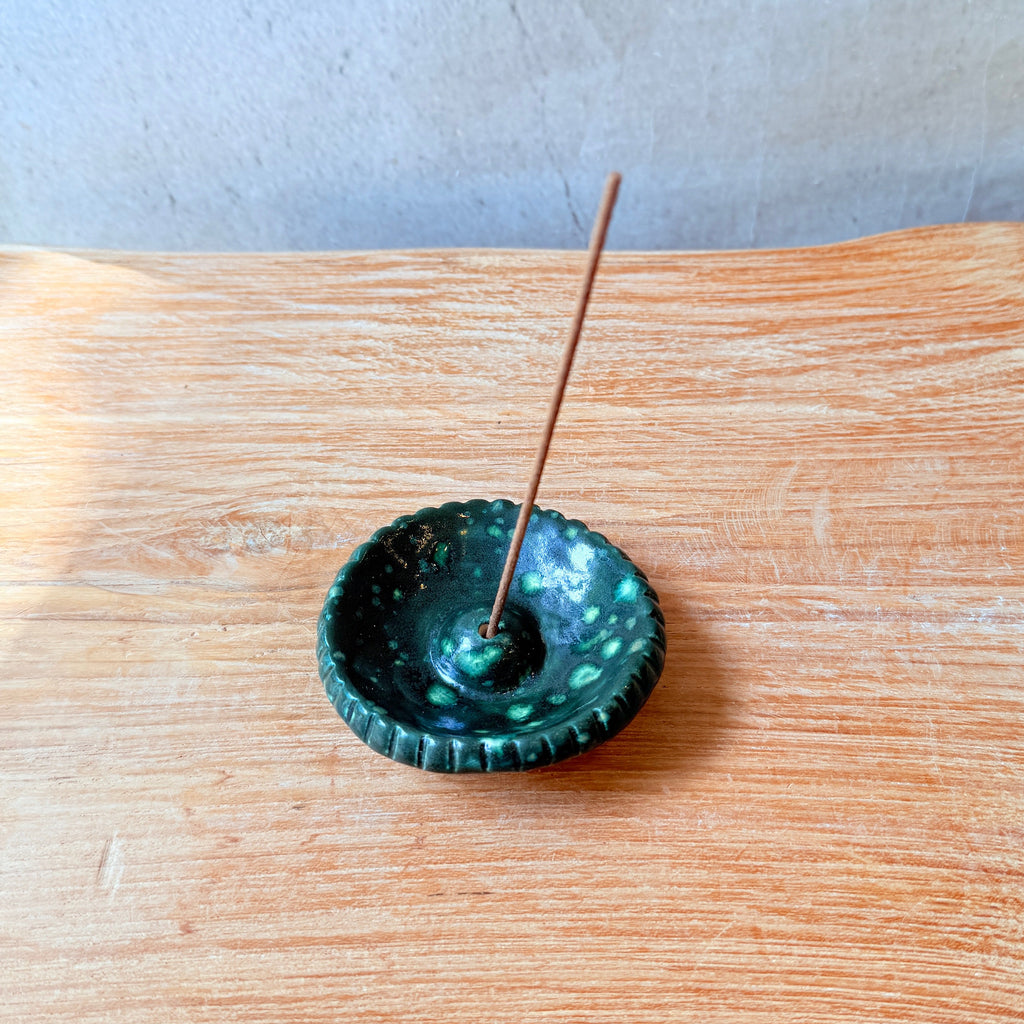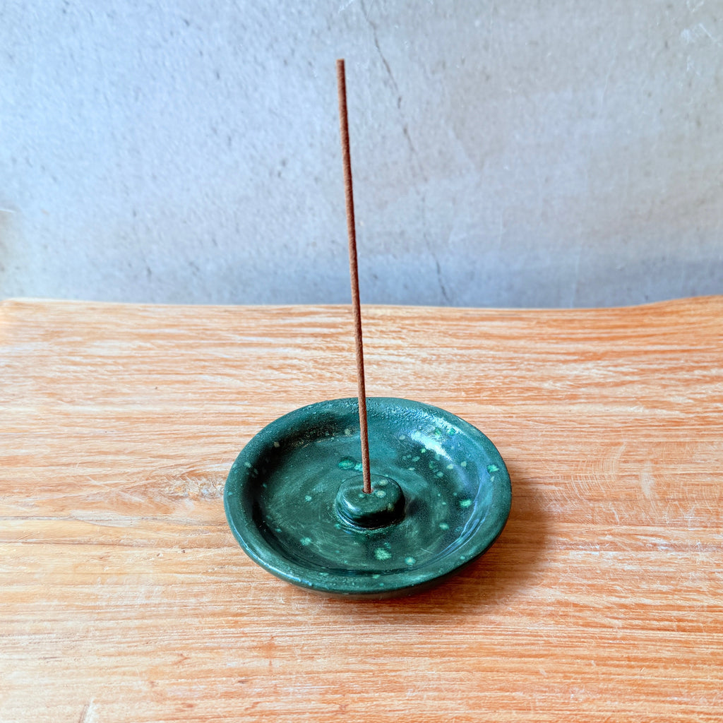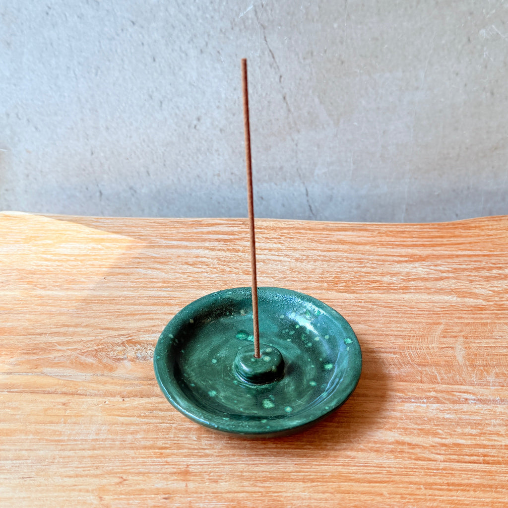 Small, circular, ceramic incense holders in a dark green glaze, by Stephanie Phillips from December 2025.