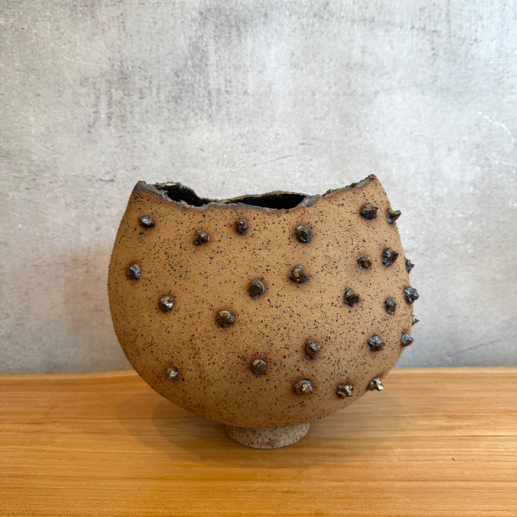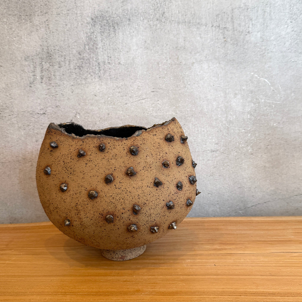 Mounted on a small footed base, this striking vessel features a body in raw, speckled clay, adorned with bronze-gloss studs outside and finished with a bronze-gloss interior.