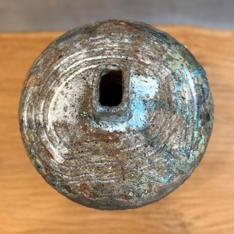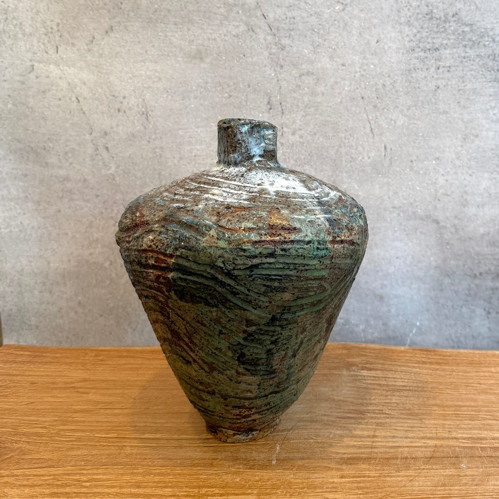 Featuring an amphora shaped body and small, square, bottle-shaped neck, it's finished in a mottled, milky, green and white glaze washed over carved, circular markings.