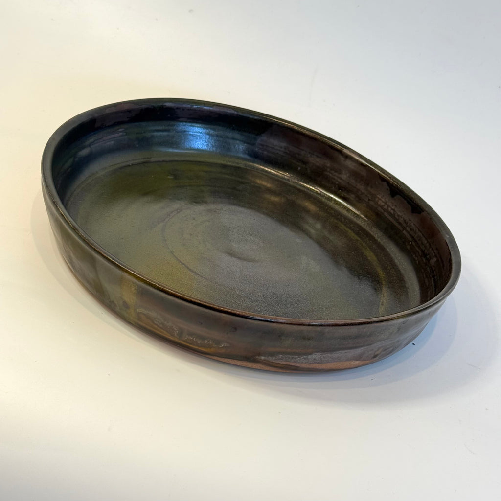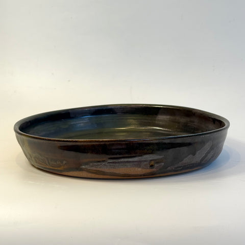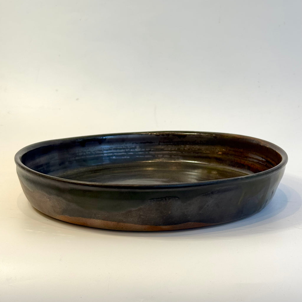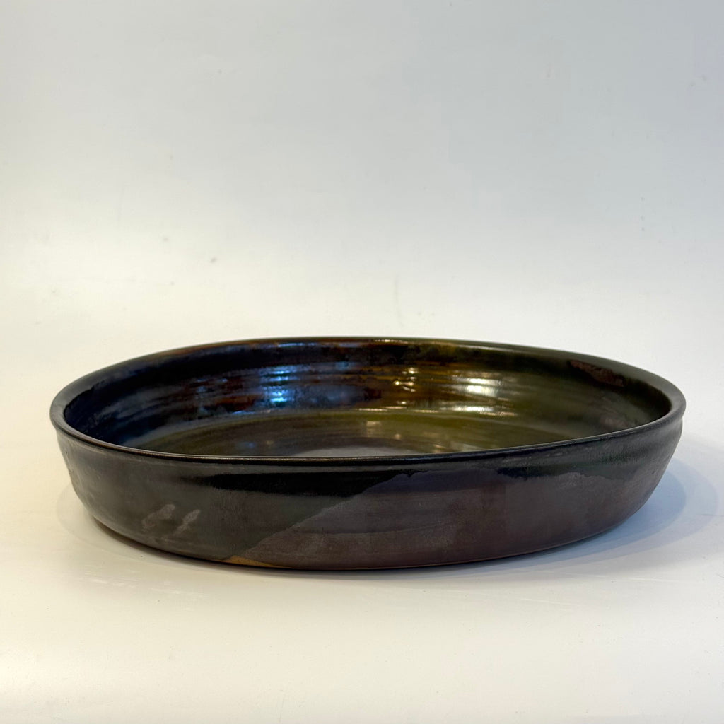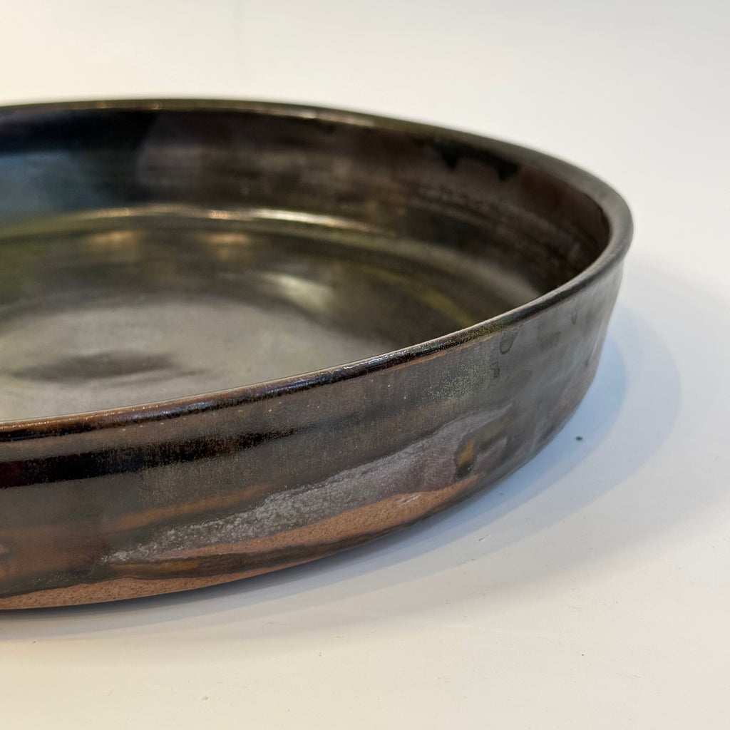 Large, high-sided ceramic platter in kurogaratsu (black Karatsu clay) by Yukiko Tsuchiya from November 2025.