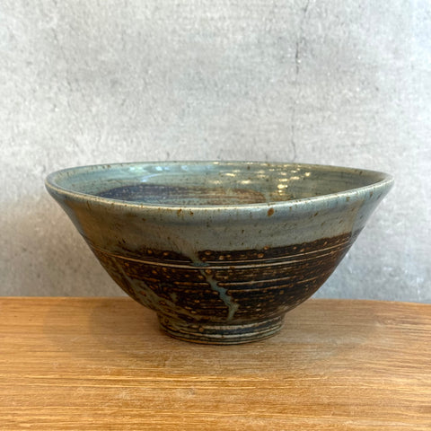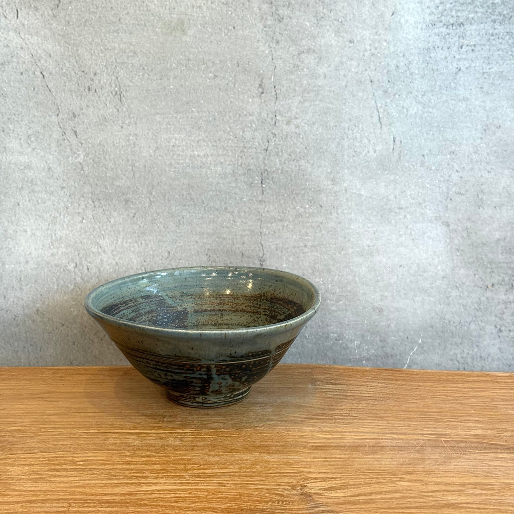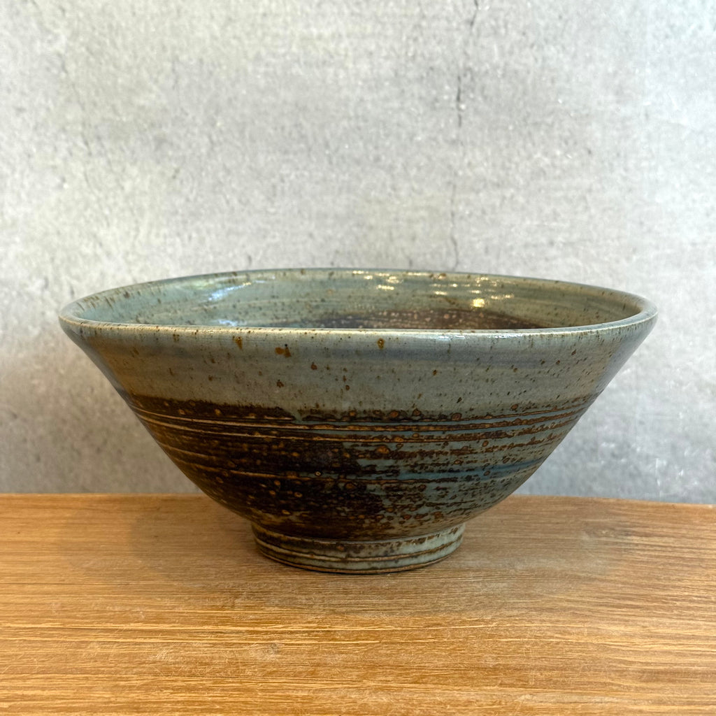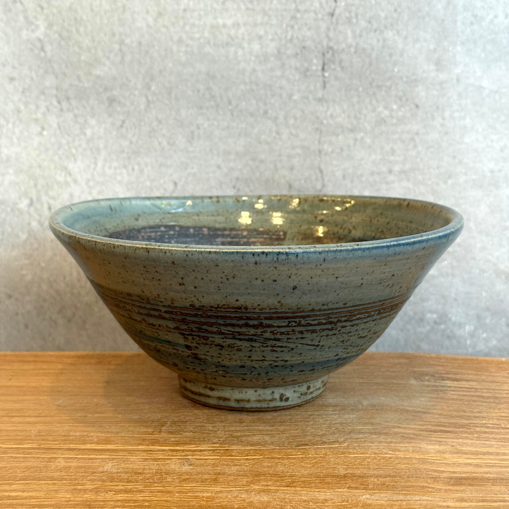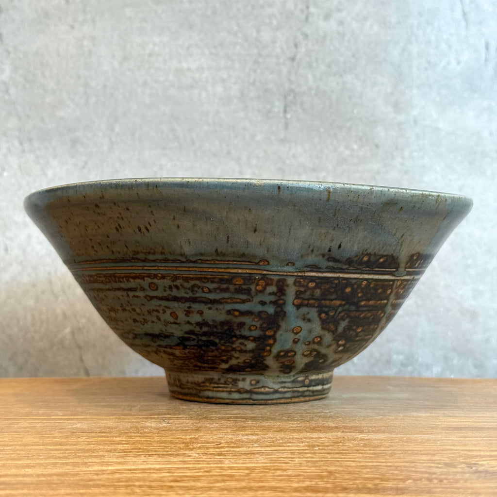 Ramen bowl in an ash glaze with blue slip by David Collins from September 2025.