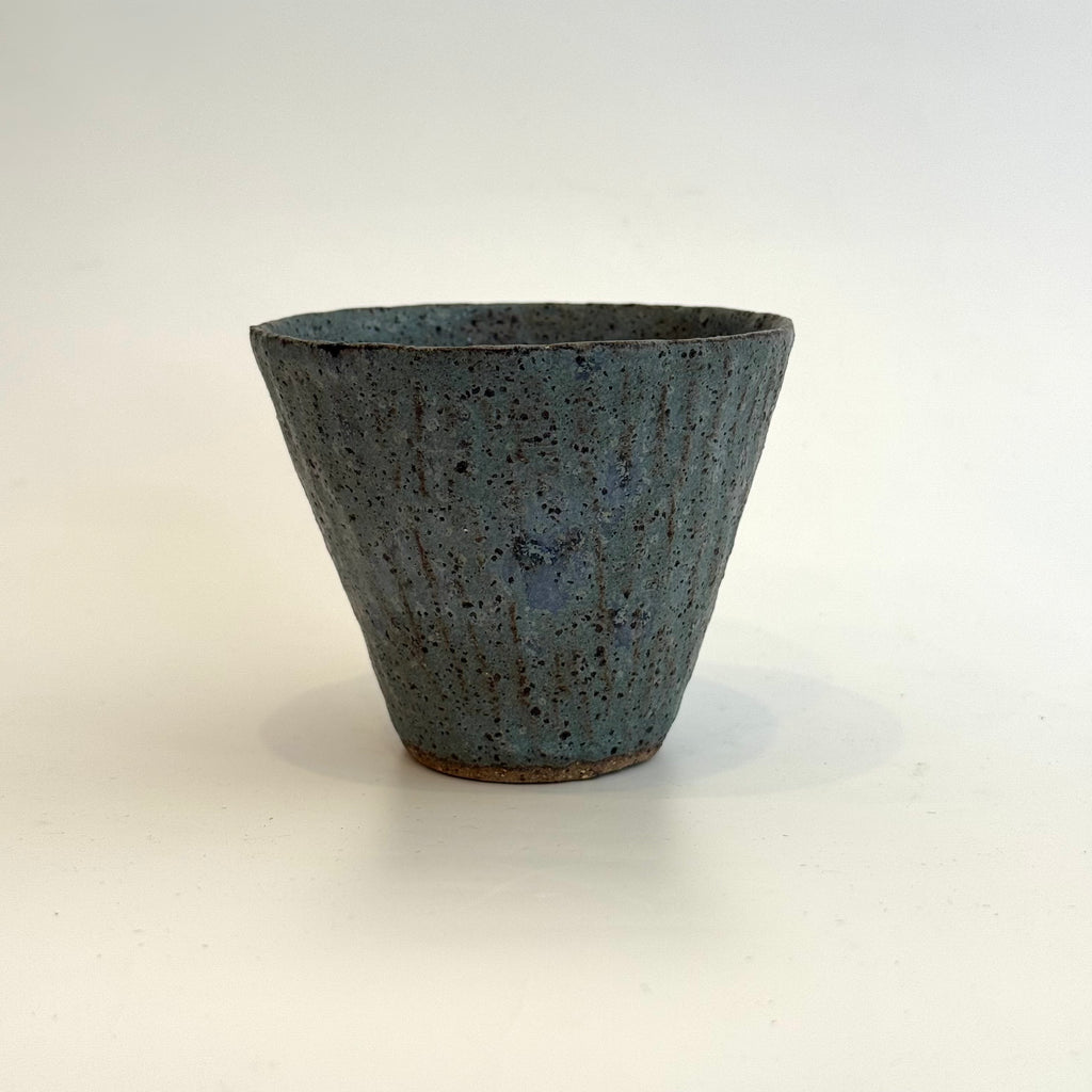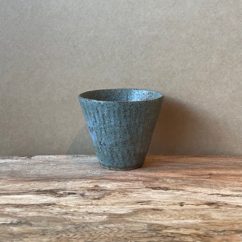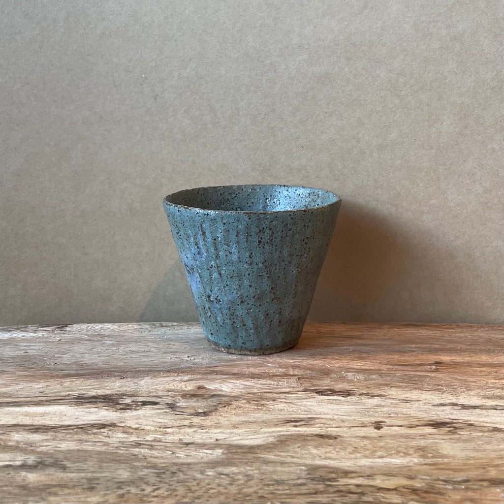 Elegant and balanced, this simple, straight-sided vessel has a beautiful, carved textured finish, overlaid in a rich, moss-green speckle glaze, making it a pleasure to hold and behold.