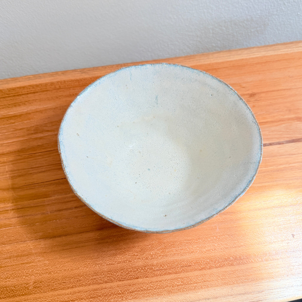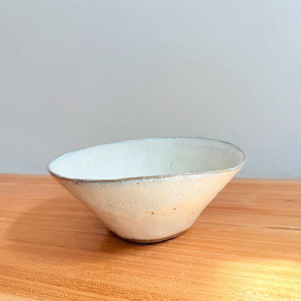 Small in diameter, with a high straight side, this gorgeous, perfectly proportioned little vessel is finished in a creamy white glaze over a faint hint of blue.