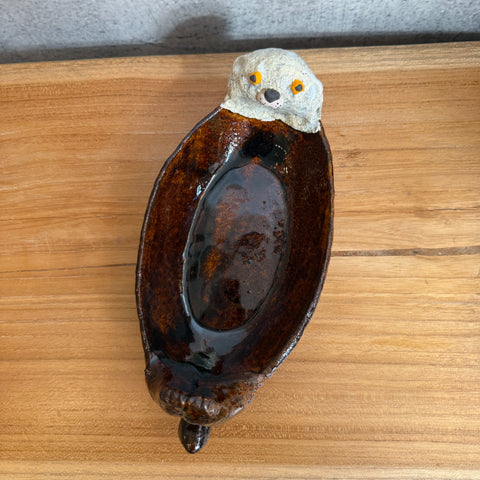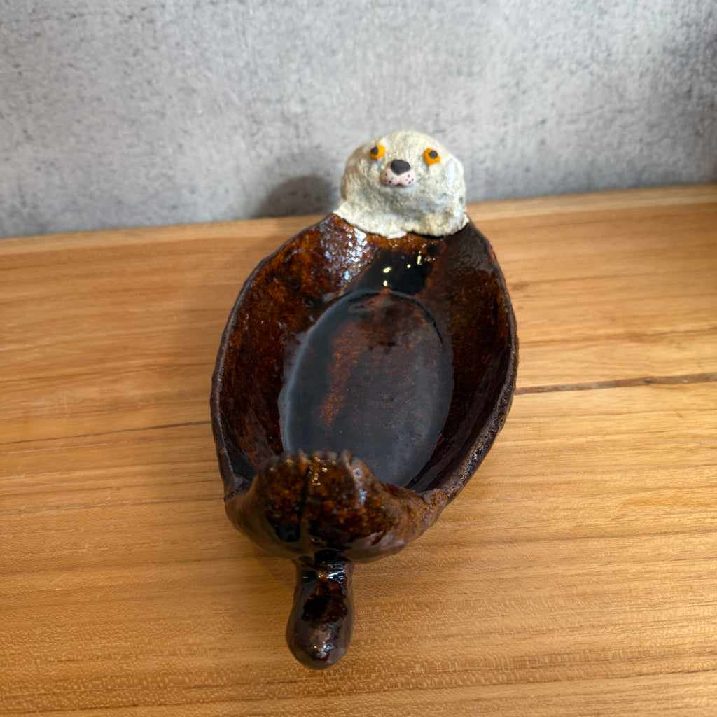 Small, high-sided ceramic dishes, shaped like a beaver floating on its back, by Hikari Masuda, from the exhibition "serious PLAY", August 2025 at DEA EAST.