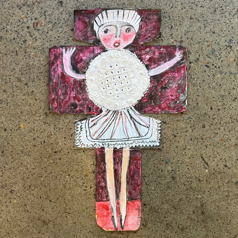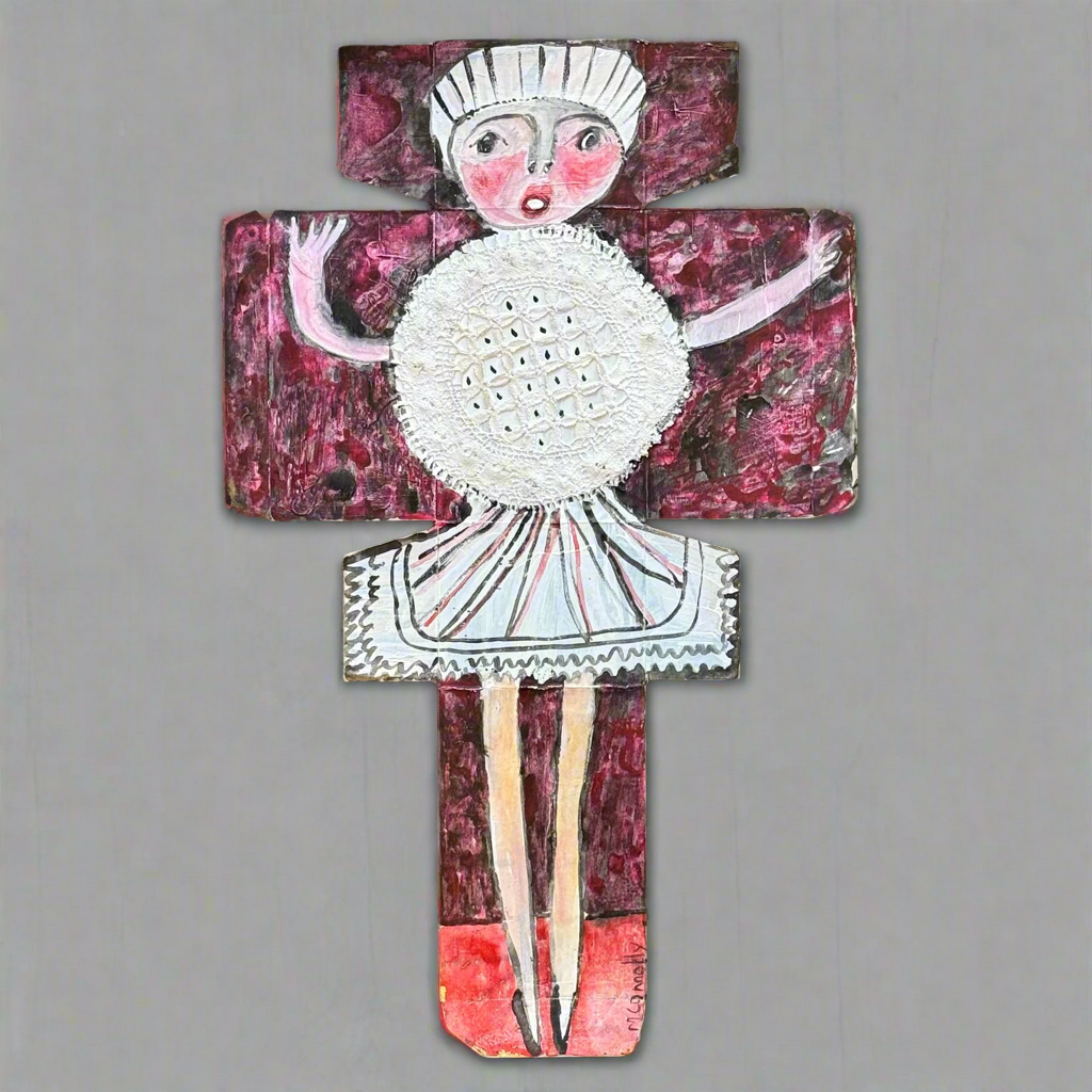 The "Doily" series comprises works on paper or card, each with a hand stitched lace doily attached. The series features women in various joyful, active poses, where the doily forms their dress.