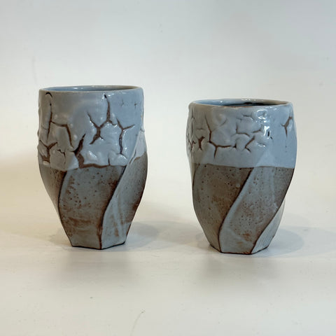 Twist faceted cups in a shino glaze by Terunobu Hirata.