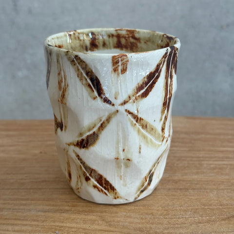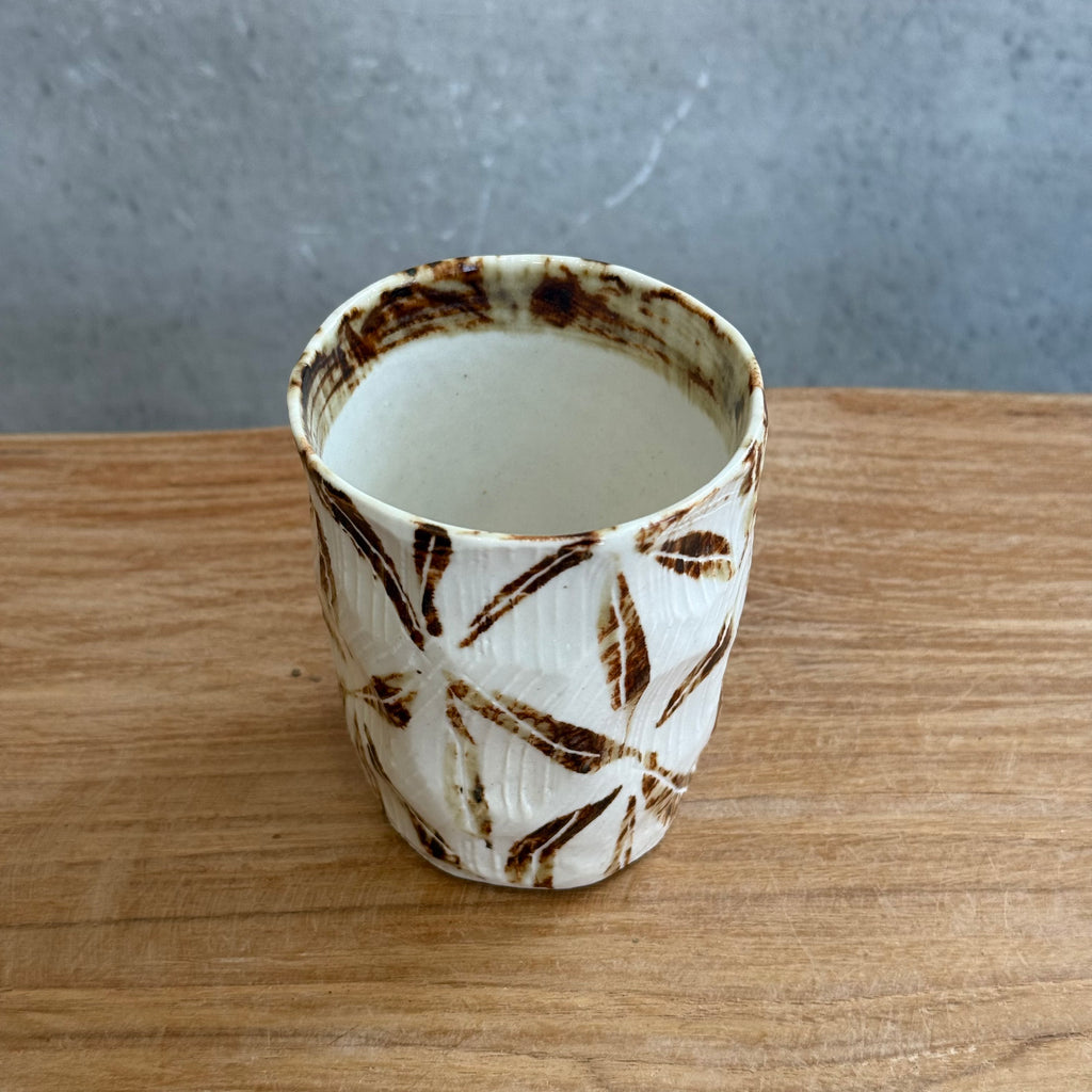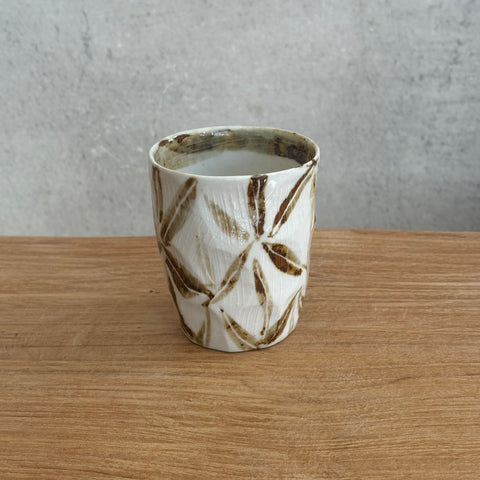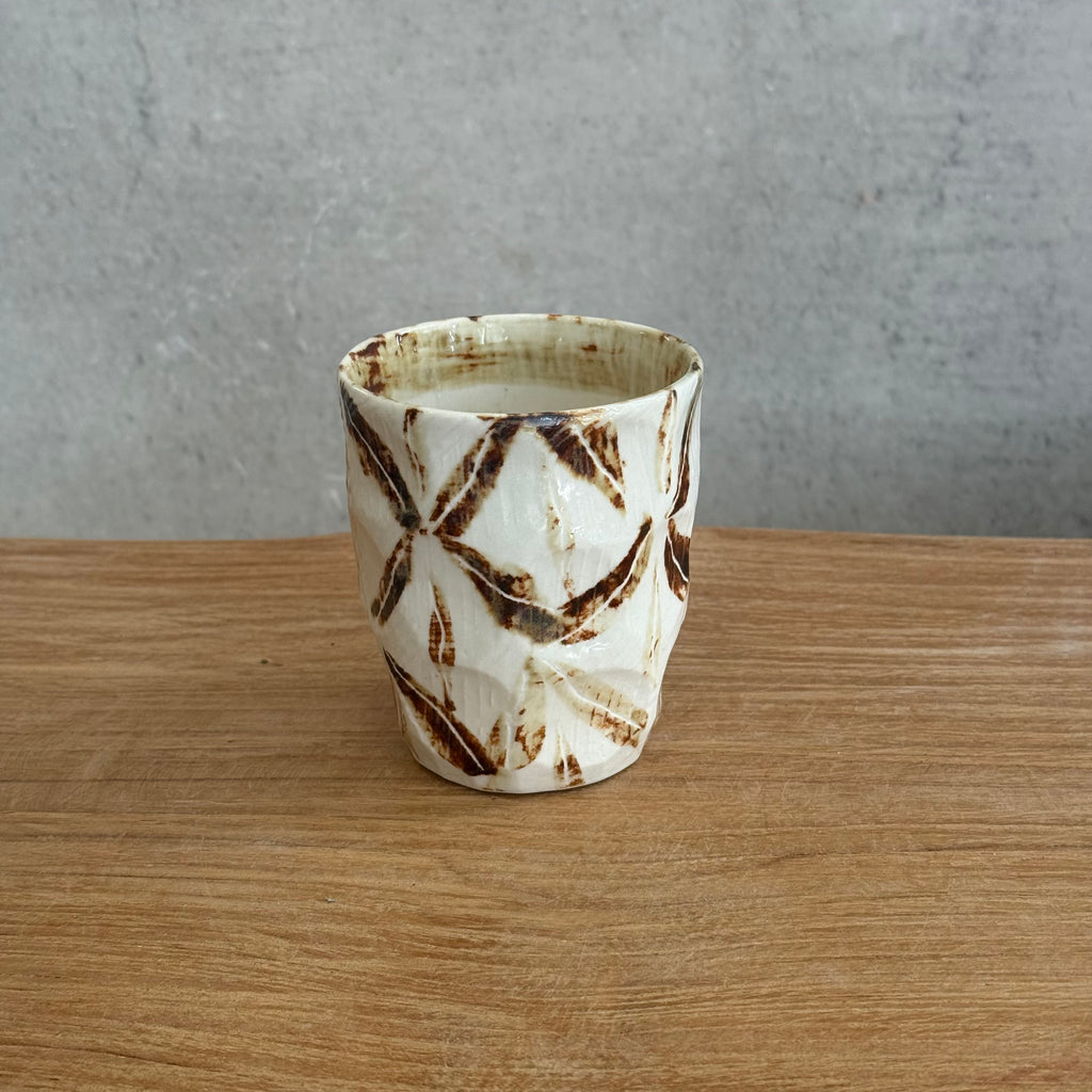 Medium beakers in a brown cross-hatch pattern from June 2025 by Australian ceramicist Timna Taylor.
