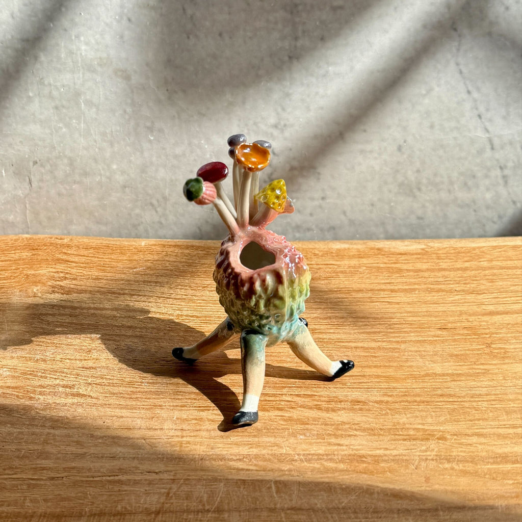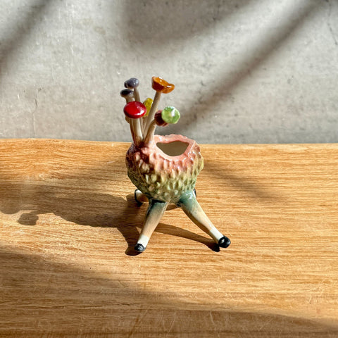 This delightful vessel is based on the shape of a lychee, lovingly rendered in gradated pinks and blues, brought to life with four black patent shoe clad legs, then imbued with extra whimsy, by a brace of multi-coloured mushrooms and toadstools growing from its top.
