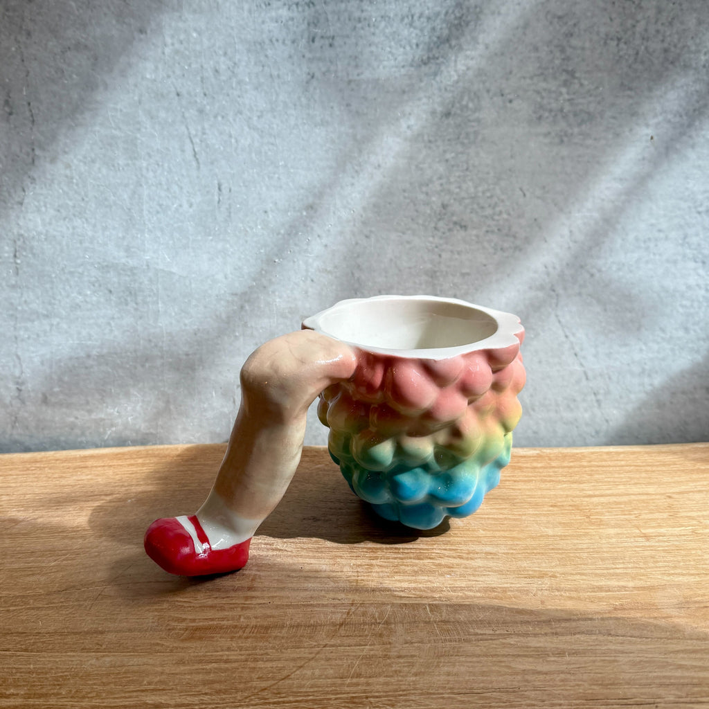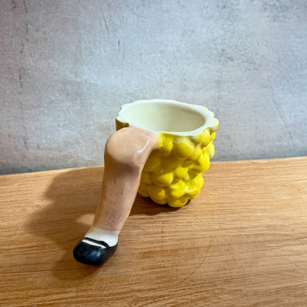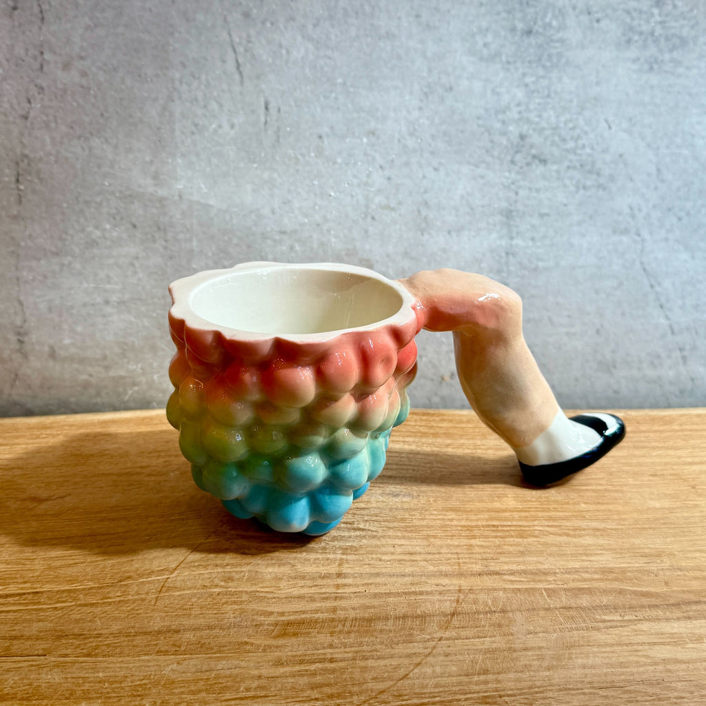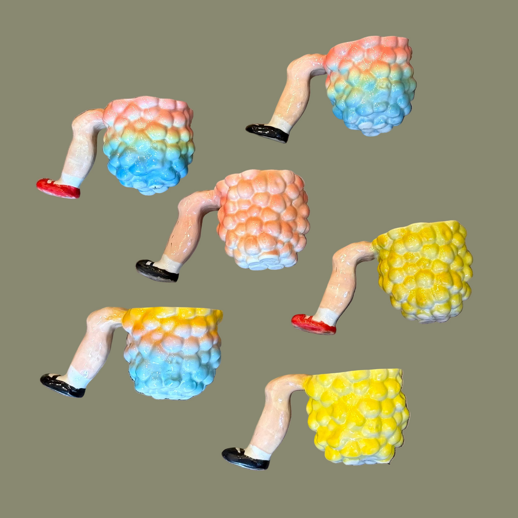 These delightful vessels are based on the shape of berry, lovingly rendered in range of vibrant colours and sporting a shoe clad leg as a handle.